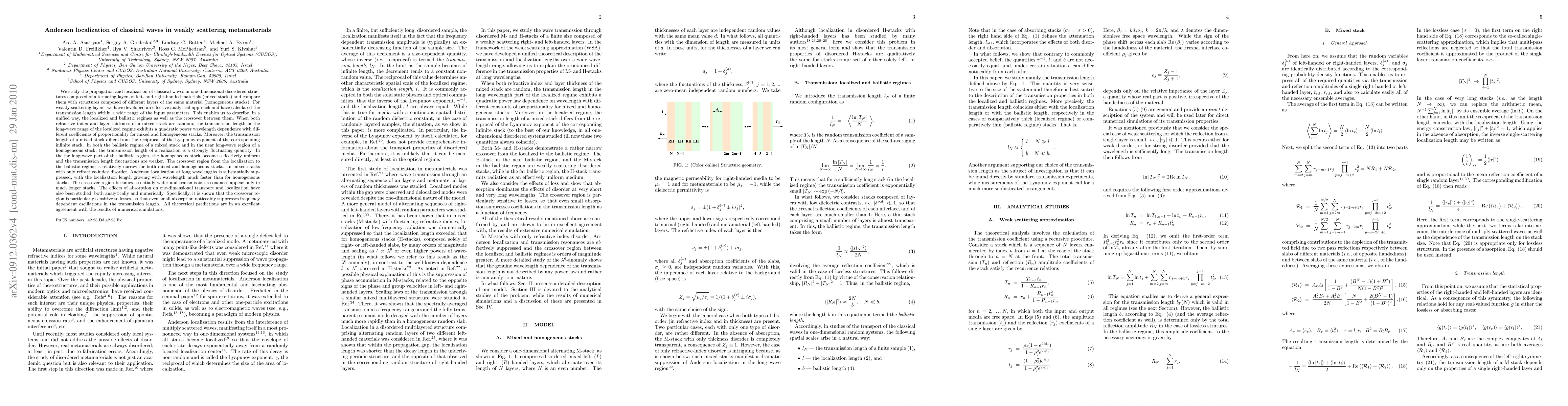 We study the propagation and localization of classical waves in one-dimensional disordered structures composed of alternating layers of left- and right-handed materials (mixed stacks) and compare them to the structures composed of different layers of the same material (homogeneous stacks). For weakly scattering layers, we have developed an effective analytical approach and have calculated the transmission length within a wide region of the input parameters. When both refractive index and layer thickness of a mixed stack are random, the transmission length in the long-wave range of the localized regime exhibits a quadratic power wavelength dependence with the coefficients different for mixed and homogeneous stacks. Moreover, the transmission length of a mixed stack differs from reciprocal of the Lyapunov exponent of the corresponding infinite stack. In both the ballistic regime of a mixed stack and in the near long-wave region of a homogeneous stack, the transmission length of a realization is a strongly fluctuating quantity. In the far long-wave part of the ballistic region, the homogeneous stack becomes effectively uniform and the transmission length fluctuations are weaker. The crossover region from the localization to the ballistic regime is relatively narrow for both mixed and homogeneous stacks. In mixed stacks with only refractive-index disorder, Anderson localization at long wavelengths is substantially suppressed, with the localization length growing with the wavelength much faster than for homogeneous stacks. The crossover region becomes essentially wider and transmission resonances appear only in much longer stacks. All theoretical predictions are in an excellent agreement with the results of numerical simulations.