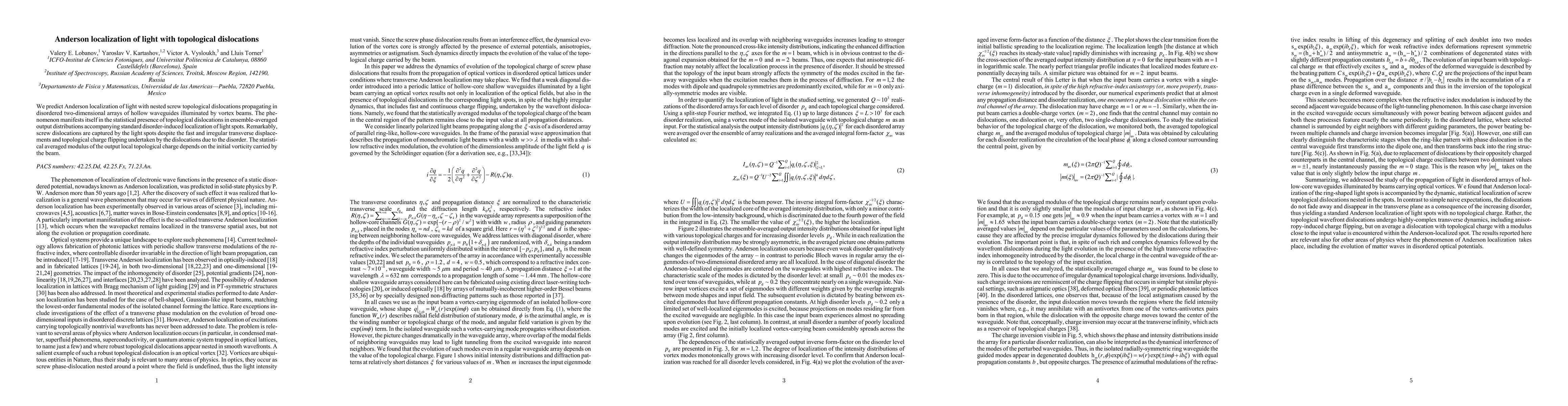 This paper predicts that light with topological dislocations can exhibit Anderson localization in disordered two-dimensional waveguide arrays, maintaining the dislocations despite rapid, irregular displacements. The statistical output shows that the average local topological charge modulus is influenced by the initial beam's vorticity.