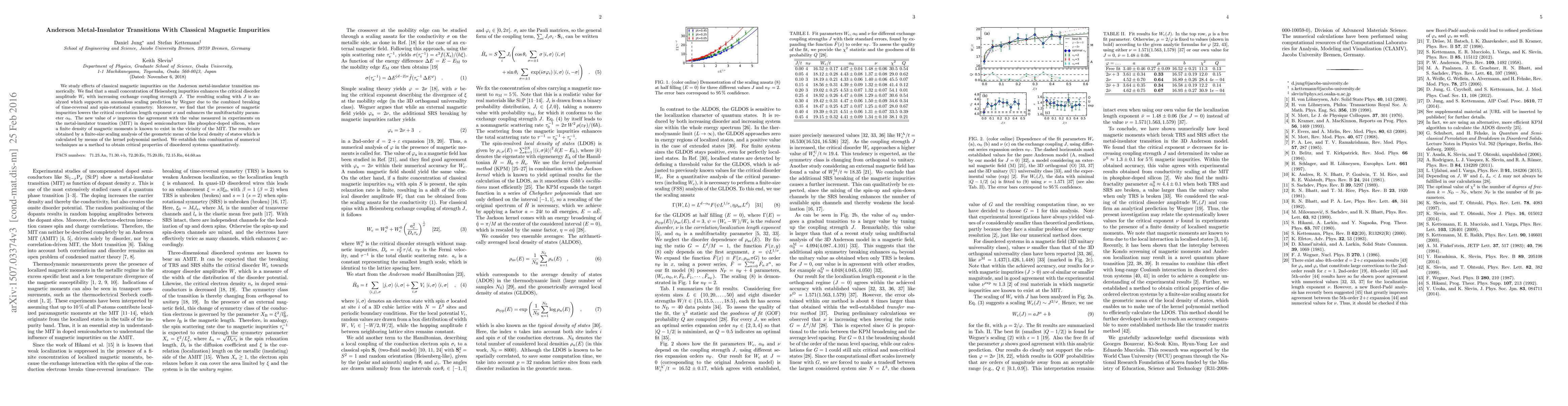 We study effects of classical magnetic impurities on the Anderson metal-insulator transition numerically. We find that a small concentration of Heisenberg impurities enhances the critical disorder amplitude $W_{\rm c}$ with increasing exchange coupling strength $J$. The resulting scaling with $J$ is analyzed which supports an anomalous scaling prediction by Wegner due to the combined breaking of time-reversal and spin-rotational symmetry. Moreover, we find that the presence of magnetic impurities lowers the critical correlation length exponent $\nu$ and enhances the multifractality parameter $\alpha_0$. The new value of $\nu$ improves the agreement with the value measured in experiments on the metal-insulator transition (MIT) in doped semiconductors like phosphor-doped silicon, where a finite density of magnetic moments is known to exist in the vicinity of the MIT. The results are obtained by a finite-size scaling analysis of the geometric mean of the local density of states which is calculated by means of the kernel polynomial method. We establish this combination of numerical techniques as a method to obtain critical properties of disordered systems quantitatively.