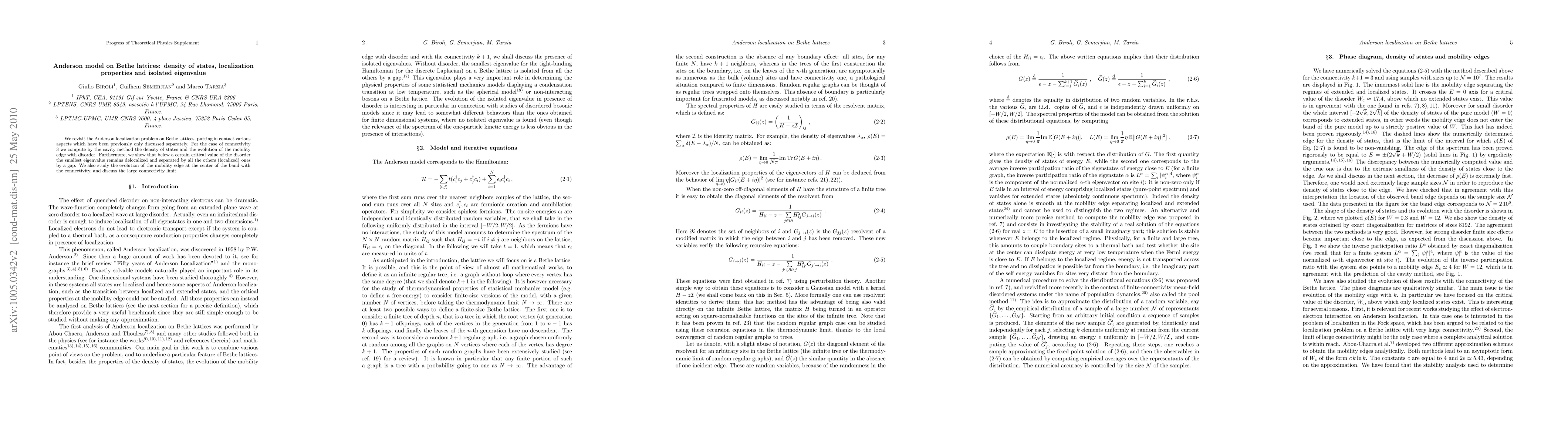 This paper examines the Anderson localization problem on Bethe lattices, focusing on the density of states and localization properties. It uses the cavity method to analyze connectivity 3, showing that below a critical disorder level, the smallest eigenvalue remains delocalized and separated by a gap from localized eigenvalues.