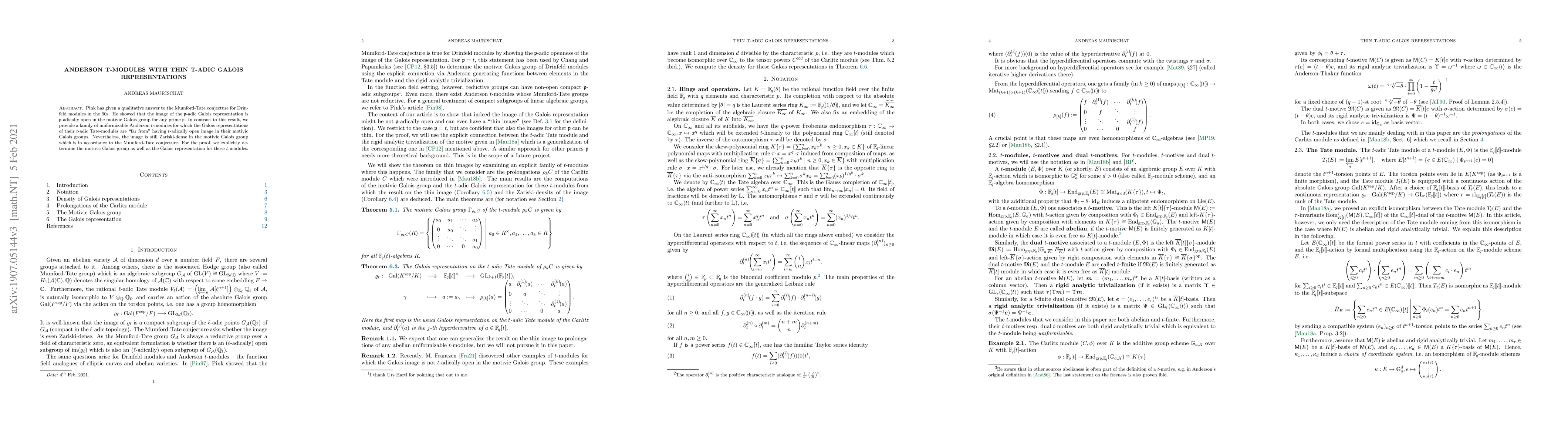 This paper contrasts Pink's result on v-adic Galois representations for Drinfeld modules by presenting a family of Anderson t-modules where the t-adic Galois representations have images that are not v-adically open but remain Zariski-dense, aligning with the Mumford-Tate conjecture. The proof involves explicit determination of the motivic Galois group and the associated Galois representation.