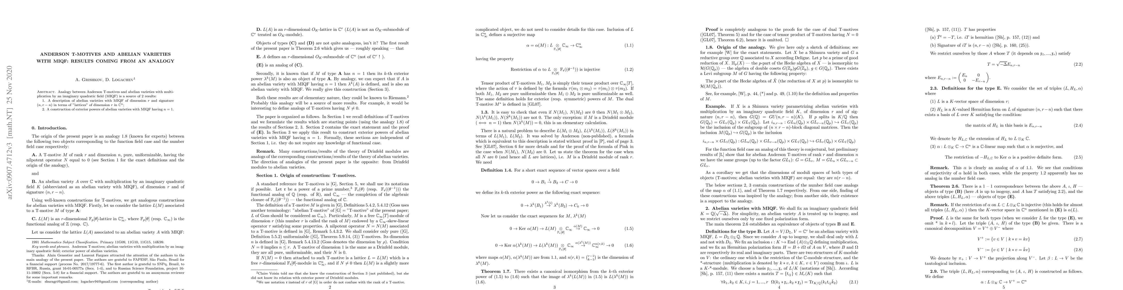 Summary: This paper explores the analogy between Anderson T-motives and abelian varieties with multiplication by an imaginary quadratic field (MIQF), yielding two results: a description of MIQF abelian varieties in terms of lattices in complex spaces, and a construction of exterior powers for MIQF abelian varieties with $n=1$.