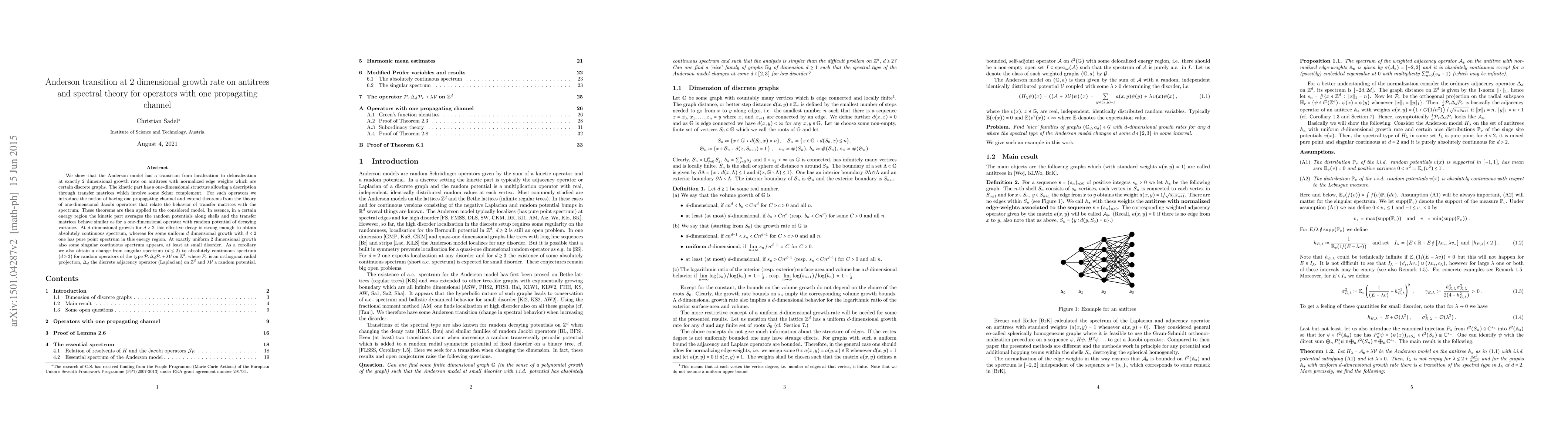 This paper demonstrates the Anderson transition in the 2-dimensional growth rate on antitrees, showing localization-to-delocalization behavior. It introduces the concept of "one propagating channel" for operators with a one-dimensional structure, extending theorems from one-dimensional Jacobi operators to describe spectral behavior, resulting in different types of spectra depending on the growth dimension.