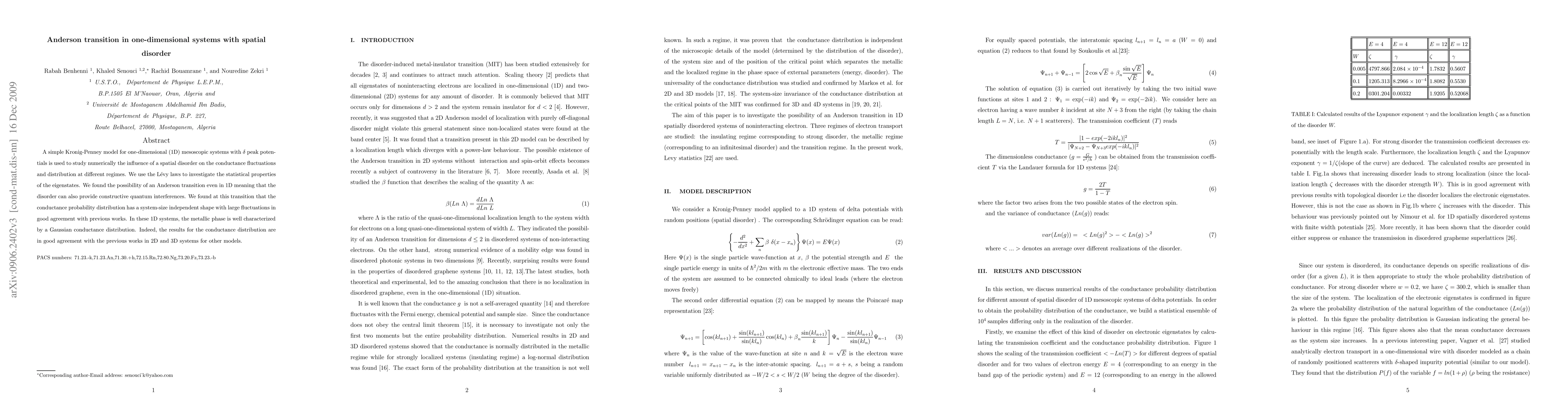 A simple Kronig-Penney model for one-dimensional (1D) mesoscopic systems with $\delta $ peak potentials is used to study numerically the influence of a spatial disorder on the conductance fluctuations and distribution at different regimes. We use the Levy laws to investigate the statistical properties of the eigenstates. We found the possibility of an Anderson transition even in 1D meaning that the disorder can also provide constructive quantum interferences. We found at this transition that the conductance probability distribution has a system-size independent shape with large fluctuations in good agreement with previous works. In these 1D systems, the metallic phase is well characterized by a Gaussian conductance distribution. Indeed, the results for the conductance distribution are in good agreement with the previous works in 2D and 3D systems for other models.