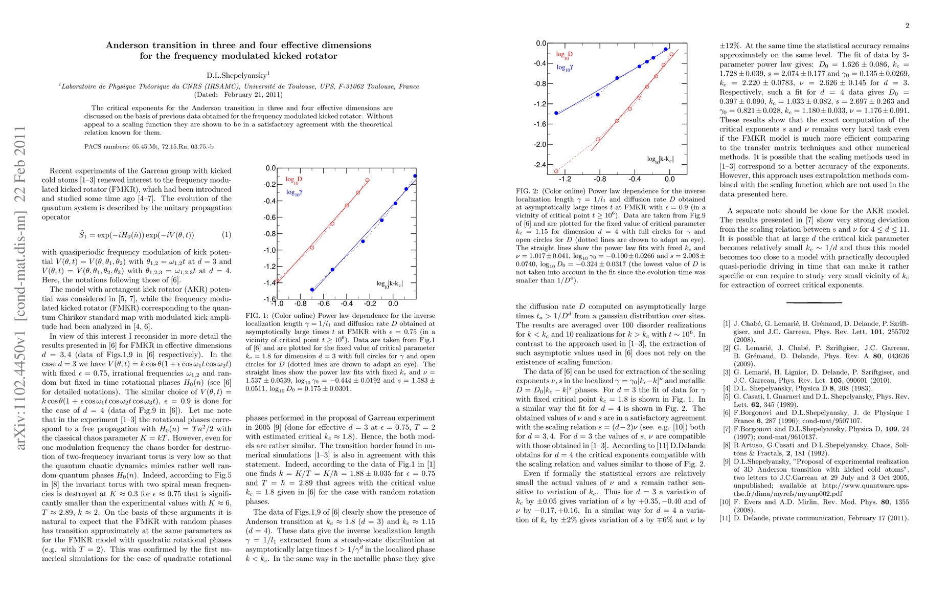 Summary: This paper analyzes the critical exponents for the Anderson transition in three and four effective dimensions using data from the frequency modulated kicked rotator, demonstrating agreement with theoretical relations without requiring a scaling function.