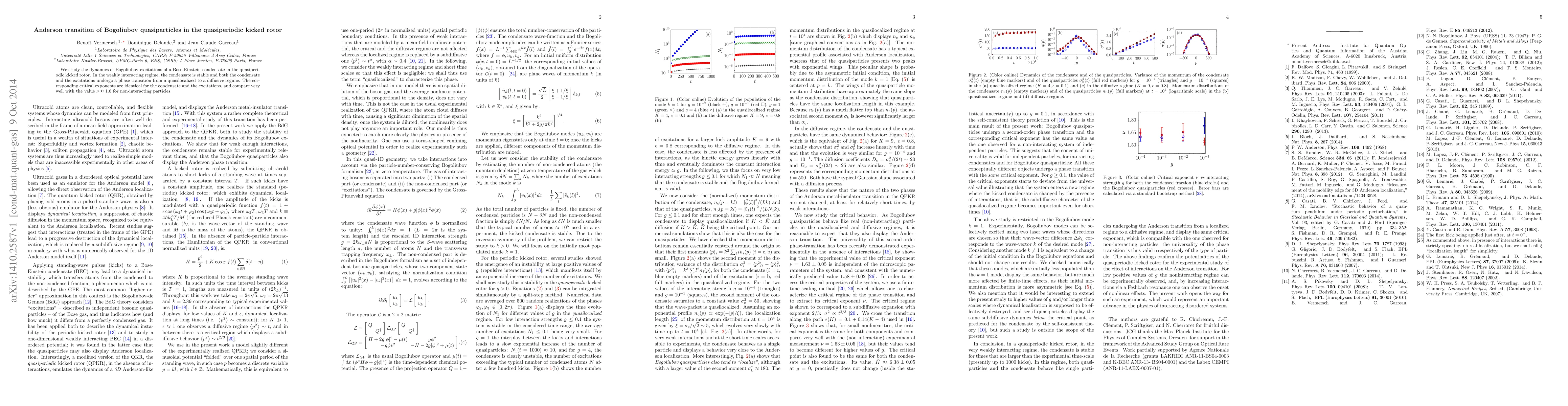 Summary: The paper investigates the Anderson transition in Bogoliubov quasiparticles within a quasiperiodic kicked rotor, finding a phase transition from quasilocalization to diffusion with critical exponents matching those of non-interacting particles at approximately $\nu\approx1.6$. The condensate remains stable throughout this transition.