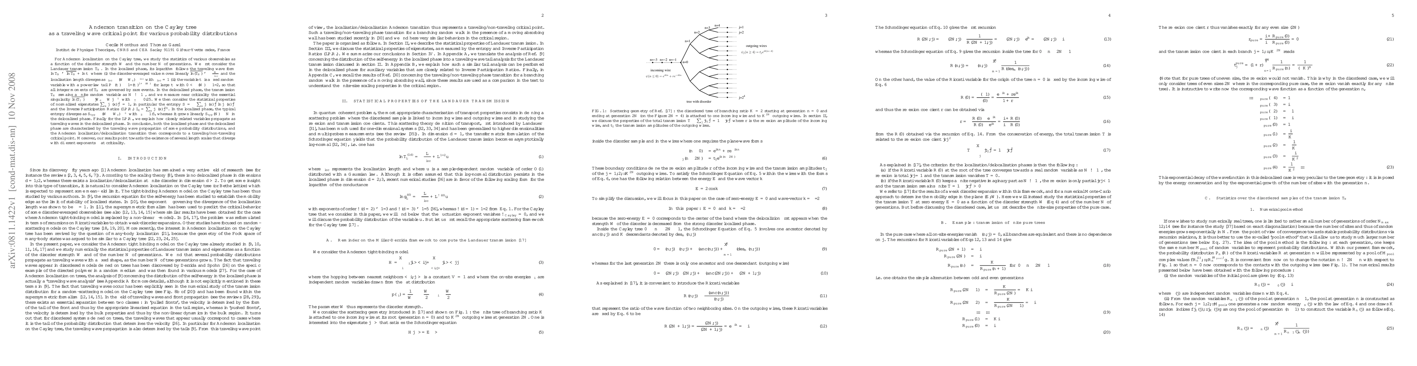 This paper investigates the Anderson localization transition on the Cayley tree, showing that both localized and delocalized phases exhibit traveling wave behavior in various observables. In the localized phase, the Landauer transmission follows a traveling wave form, while in the delocalized phase, it remains finite. The study also reveals distinct scaling behaviors for entropy and Inverse Participation Ratios, indicating a traveling/non-traveling critical point at the transition.