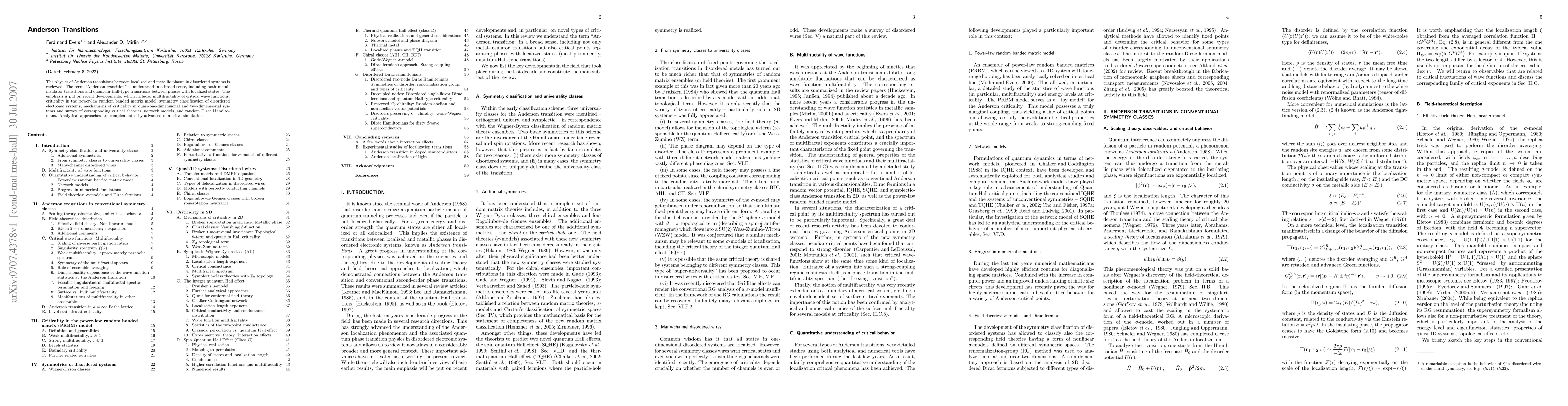 This paper reviews recent advancements in understanding Anderson transitions, focusing on the physics of localized to metallic phase changes in disordered systems, including multifractality, criticality models, and symmetry classifications. It combines analytical methods with numerical simulations to explore quasi-one-dimensional and two-dimensional systems.