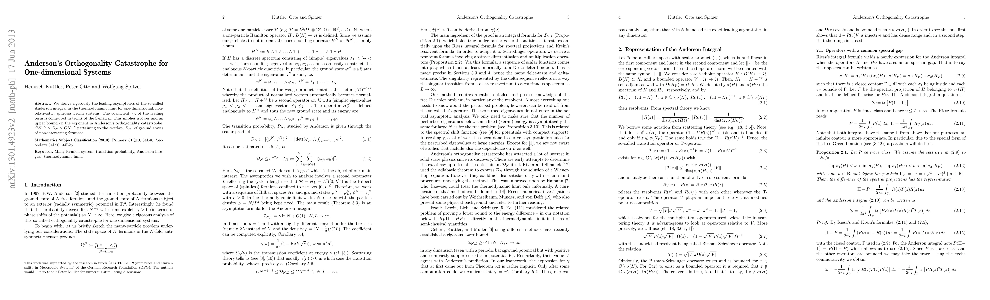 We derive rigorously the leading asymptotics of the so-called Anderson integral in the thermodynamic limit for one-dimensional, non-relativistic, spin-less Fermi systems. The coefficient, $\gamma$, of the leading term is computed in terms of the S-matrix. This implies a lower and an upper bound on the exponent in Anderson's orthogonality catastrophe, $\tilde CN^{-\tilde\gamma}\leq \mathcal{D}_N\leq CN^{-\gamma}$ pertaining to the overlap, $\mathcal{D}_N$, of ground states of non-interacting fermions.