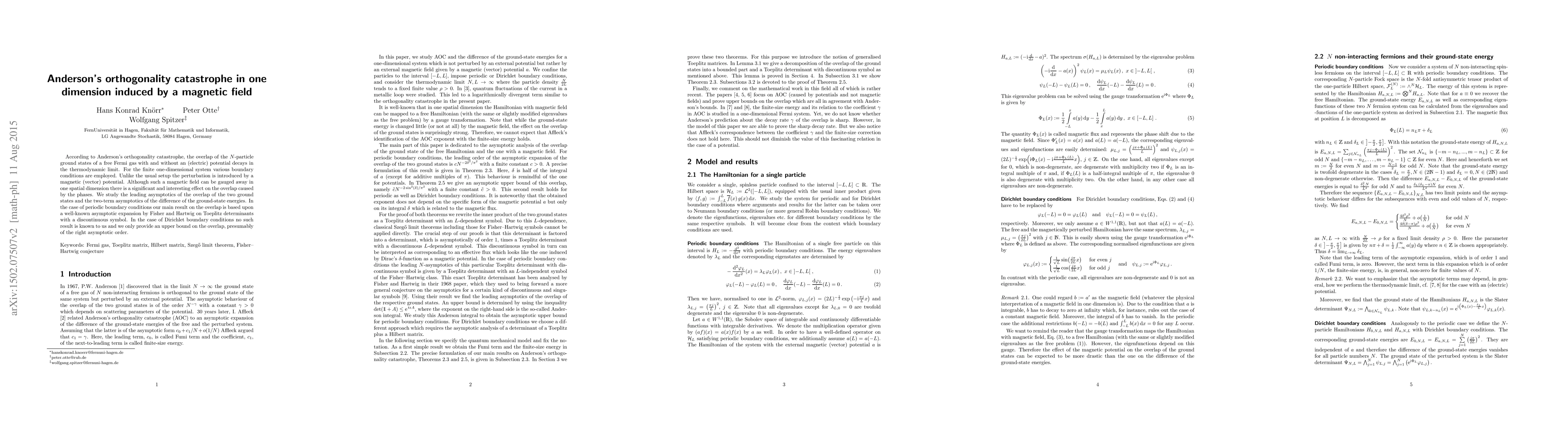 According to Anderson's orthogonality catastrophe, the overlap of the $N$-particle ground states of a free Fermi gas with and without an (electric) potential decays in the thermodynamic limit. For the finite one-dimensional system various boundary conditions are employed. Unlike the usual setup the perturbation is introduced by a magnetic (vector) potential. Although such a magnetic field can be gauged away in one spatial dimension there is a significant and interesting effect on the overlap caused by the phases. We study the leading asymptotics of the overlap of the two ground states and the two-term asymptotics of the difference of the ground-state energies. In the case of periodic boundary conditions our main result on the overlap is based upon a well-known asymptotic expansion by Fisher and Hartwig on Toeplitz determinants with a discontinuous symbol. In the case of Dirichlet boundary conditions no such result is known to us and we only provide an upper bound on the overlap, presumably of the right asymptotic order.