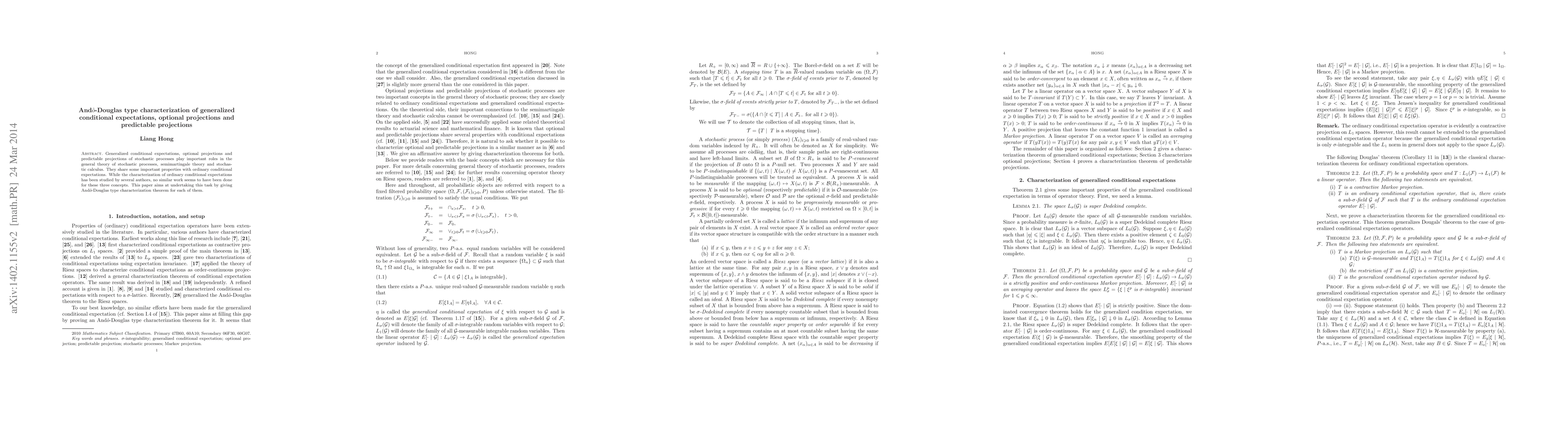 This paper provides an And$ ilde{o}$-Douglas type characterization theorem for generalized conditional expectations, optional projections, and predictable projections in stochastic processes, highlighting their key properties and implications.