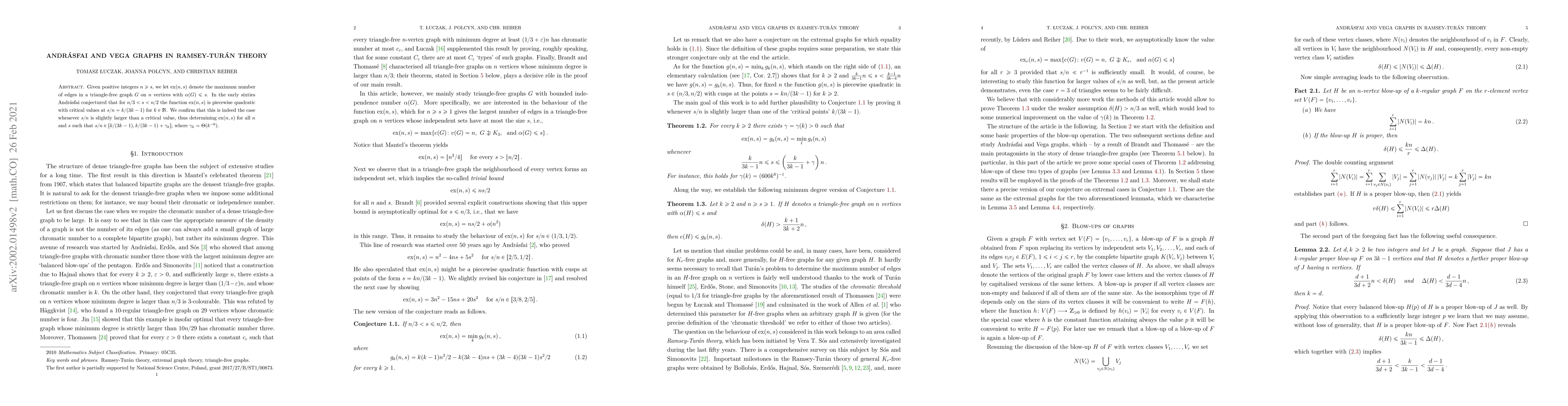 This paper confirms Andrásfai's conjecture regarding the piecewise quadratic nature of ${\mathrm{ex}}(n,s)$ for triangle-free graphs, specifically showing it holds when $s/n$ is slightly larger than critical values $k/(3k-1)$. The results determine ${\mathrm{ex}}(n,s)$ for $s/n$ in the interval $[k/(3k-1), k/(3k-1)+\gamma_k]$ with $\gamma_k=\Theta(k^{-6})$.