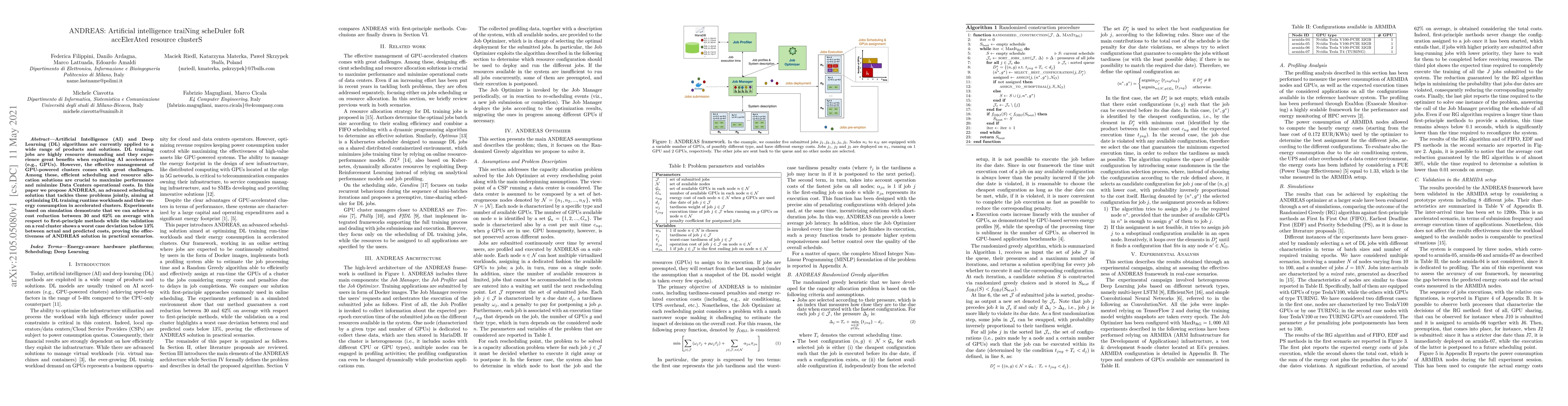 The paper proposes ANDREAS, an AI training scheduler for optimizing deep learning workloads and energy consumption in GPU-powered clusters. Simulation results show a 30-62% cost reduction compared to traditional methods, with real-cluster validation demonstrating a maximum 13% deviation in cost prediction.