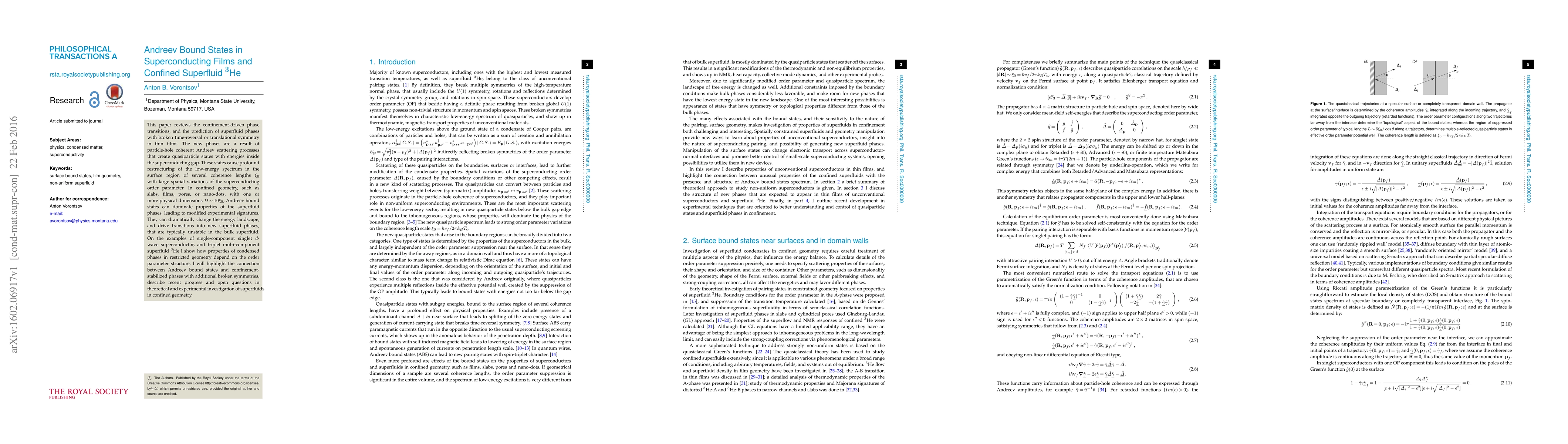 This paper reviews confinement-driven phase transitions in thin films, predicting new superfluid phases with broken symmetries due to Andreev bound states. These states significantly alter the low-energy spectrum and can stabilize new superfluid phases typically unstable in bulk.