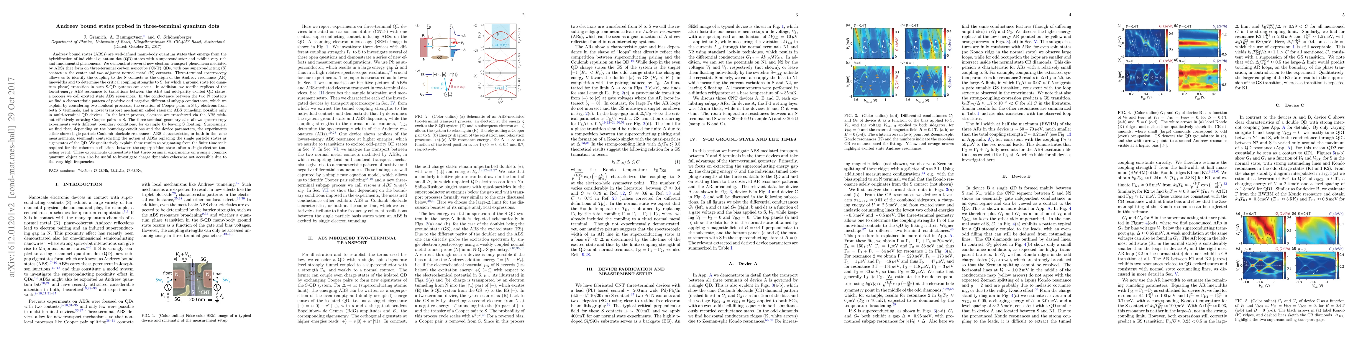 We demonstrate several new electron transport phenomena mediated by Andreev bound states (ABSs) that form on three-terminal carbon nanotube (CNT) QDs, with one superconducting (S) contact in the center and two adjacent normal metal (N) contacts. Three-terminal spectroscopy allows us to identify the coupling to the N contacts as the origin of the Andreev resonance (AR) linewidths and to determine the critical coupling strengths to S, for which a ground state transition S-QD systems can occur. We ascribe replicas of the lowest-energy ABS resonance to transitions between the ABS and odd-parity excited QD states, a process called excited state ABS resonances. In the conductance between the two N contacts we find a characteristic pattern of positive and negative differential subgap conductance, which we explain by considering two nonlocal processes, the creation of Cooper pairs in S by electrons from both N terminals, and a novel mechanism called resonant ABS tunneling. In the latter, electrons are transferred via the ABS without creating Cooper pairs in S. The three-terminal geometry also allows spectroscopy experiments with different boundary conditions, for example by leaving S floating. Surprisingly, we find that, depending on the boundary conditions, the experiments either show single-particle Coulomb blockade resonances, ABS characteristics, or both in the same measurements, seemingly contradicting the notion of ABSs replacing the single particle states as eigenstates of the QD. We qualitatively explain these results as originating from the finite time scale required for the coherent oscillations between the superposition states after a single electron tunneling event. These experiments demonstrate that three-terminal experiments on a single complex quantum object can also be useful to investigate charge dynamics otherwise not accessible due to the very high frequencies.