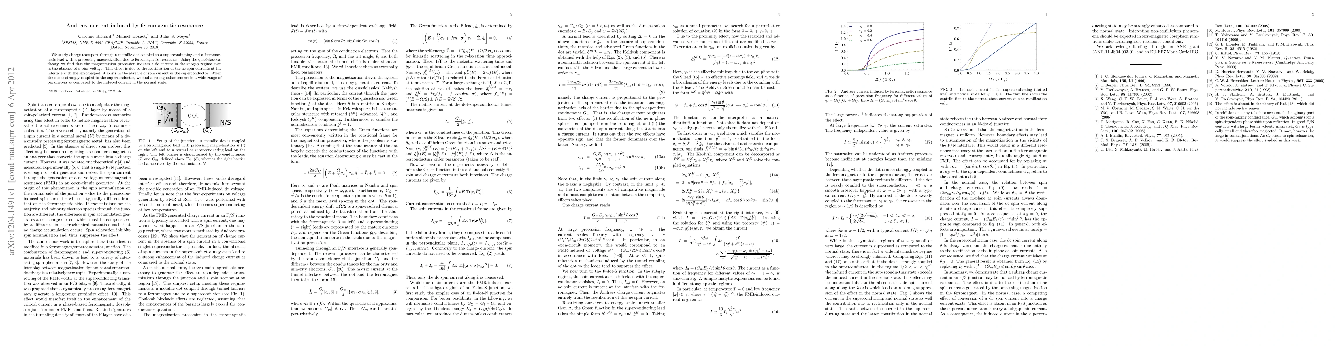 This paper investigates charge transport through a metallic dot connected to a superconductor and a ferromagnetic lead, revealing that ferromagnetic resonance induces a direct current in the subgap regime without bias voltage. The effect arises from the rectification of alternating spin currents at the ferromagnet interface, leading to a significant enhancement in the induced current when the dot is strongly coupled to the superconductor.