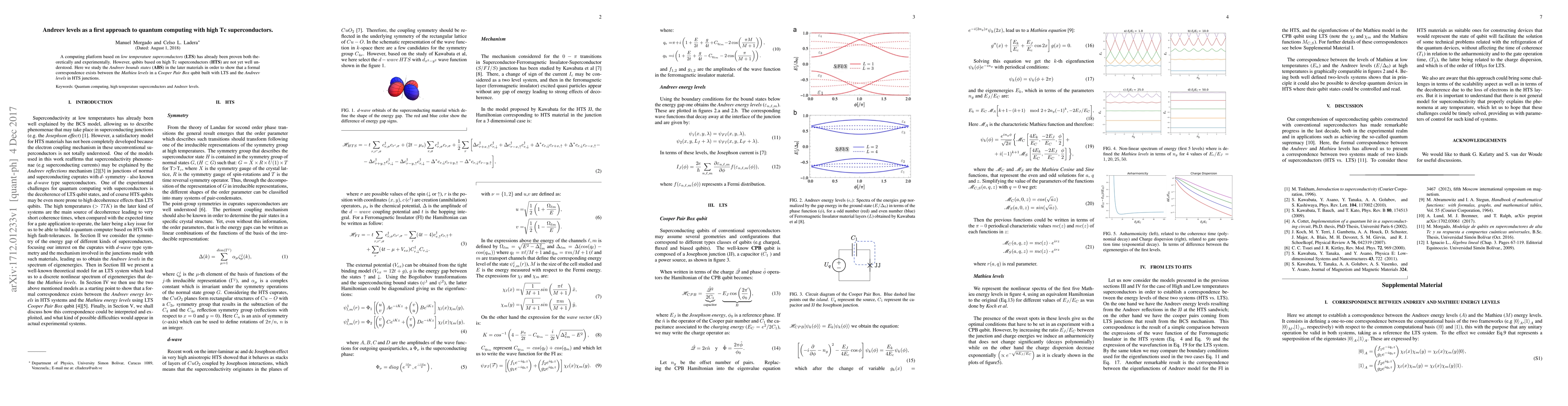 Researchers explored Andreev levels in high Tc superconductors to find a formal correspondence with Mathieu levels in Cooper Pair Box qubits, offering a potential platform for quantum computing.