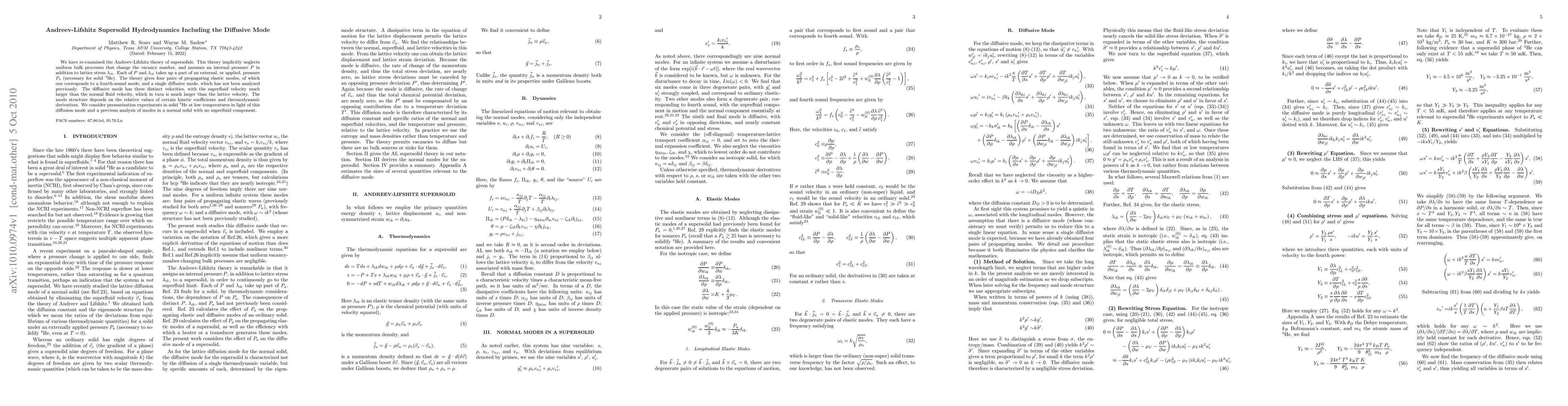 Researchers re-examined the Andreev-Lifshitz theory of supersolids, discovering a previously unanalyzed diffusive mode with distinct velocities that depend on relative values of kinetic coefficients and thermodynamic derivatives. The findings have implications for pressurization experiments in solid 4He at low temperatures.