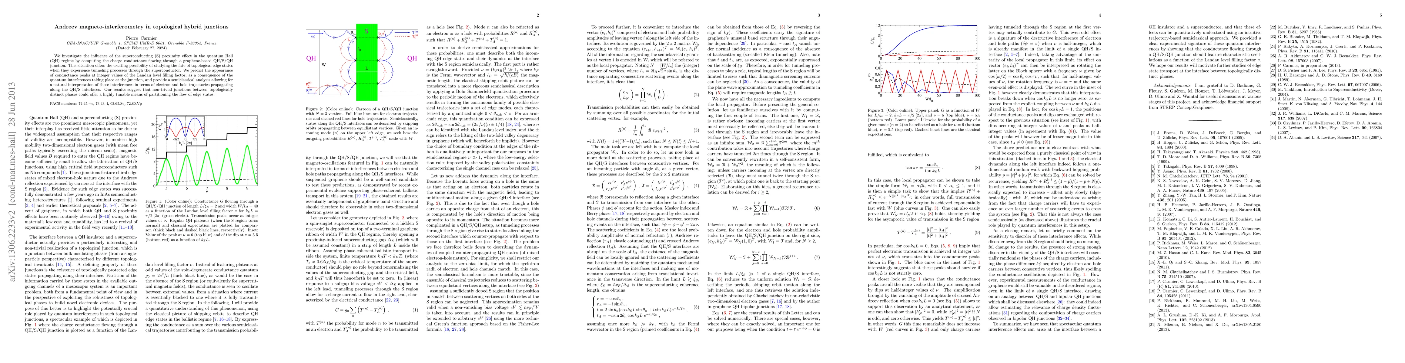 We investigate the influence of the superconducting (S) proximity effect in the quantum Hall (QH) regime by computing the charge conductance flowing through a graphene-based QH/S/QH junction. This situation offers the exciting possibility of studying the fate of topological edge states when they experience tunneling processes through the superconductor. We predict the appearance of conductance peaks at integer values of the Landau level filling factor, as a consequence of the quantum interferences taking place at the junction, and provide a semiclassical analysis allowing for a natural interpretation of these interferences in terms of electron and hole trajectories propagating along the QH/S interfaces. Our results suggest that non-trivial junctions between topologically distinct phases could offer a highly tunable means of partitioning the flow of edge states.