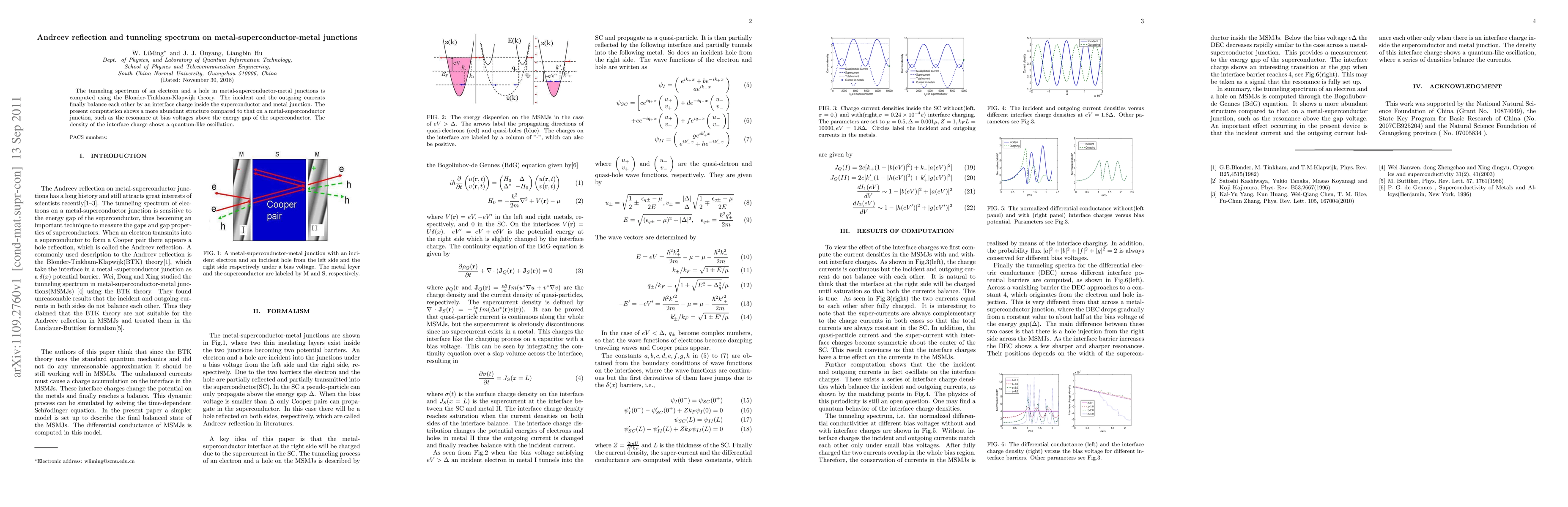 This paper computes the tunneling spectrum in metal-superconductor-metal junctions using the Blonder-Tinkham-Klapwijk theory, revealing a more complex structure than metal-superconductor junctions, including resonances above the superconductor's energy gap and quantum-like oscillations in interface charge density.