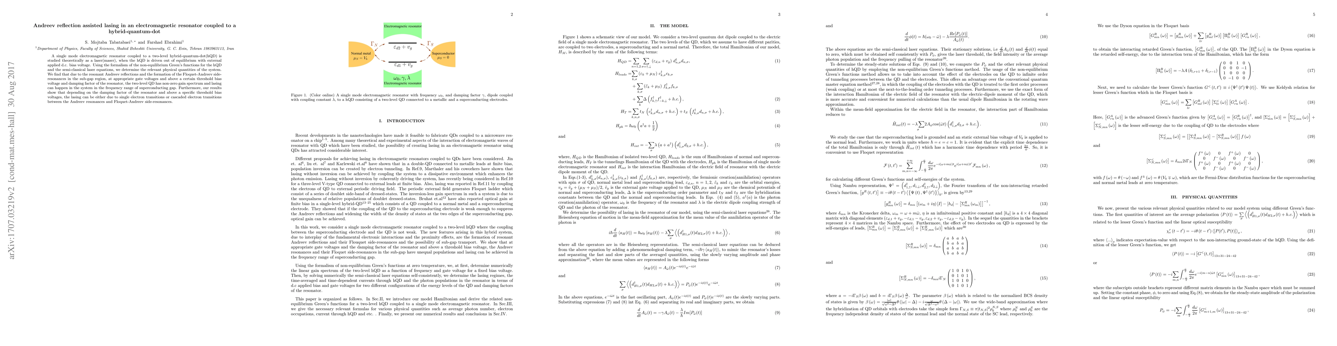 A single mode electromagnetic resonator coupled to a two-level hybrid-quantum-dot(hQD) is studied theoretically as a laser(maser), when the hQD is driven out of equilibrium with external applied d.c. bias voltage. Using the formalism of the non-equilibrium Green's functions for the hQD and the semi-classical laser equations, we determine the relevant physical quantities of the system. We find that due to the resonant Andreev reflections and the formation of the Floquet-Andreev side-resonances in the sub-gap region, at appropriate gate voltages and above a certain threshold bias voltage and damping factor of the resonator, the two-level QD has non-zero gain spectrum and lasing can happen in the system in the frequency range of superconducting gap. Furthermore, our results show that depending on the damping factor of the resonator and above a specific threshold bias voltages, the lasing can be either due to single electron transitions or cascaded electron transitions between the Andreev resonances and Floquet-Andreev side-resonances.