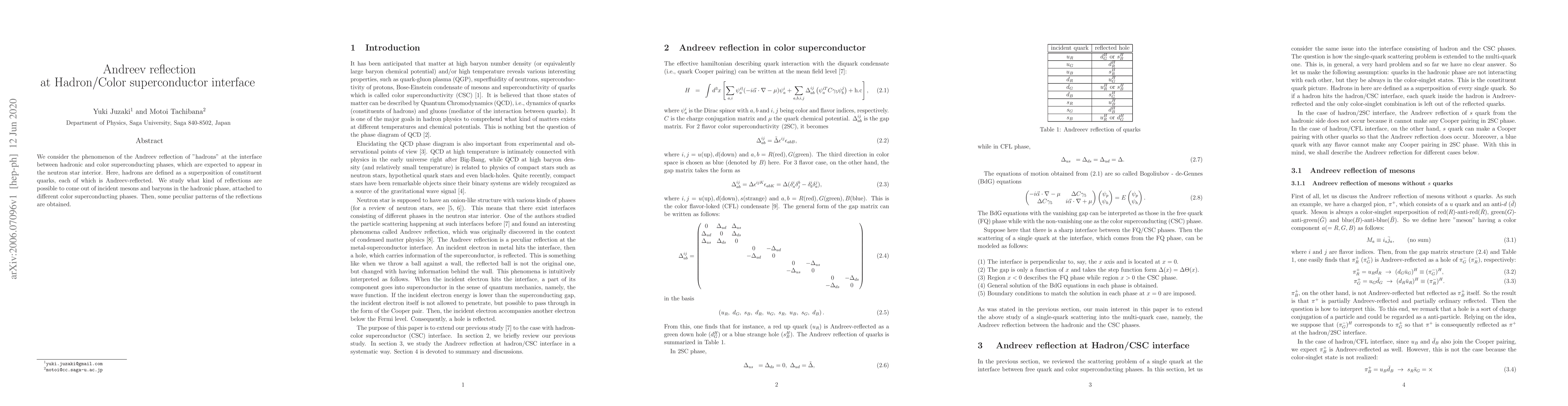 The research investigates Andreev reflection at the interface between hadronic and color superconducting phases, expected in neutron star interiors. It considers single-quark scattering and extends this to multi-quark cases, specifically hadrons, assuming quarks in the hadronic phase are non-interacting but always in color-singlet states.