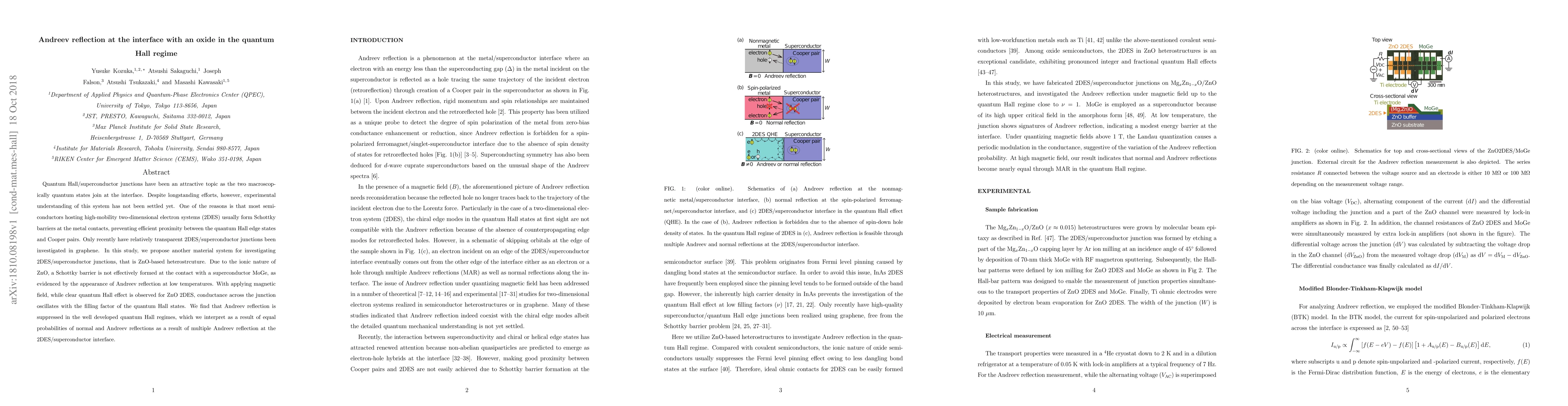 This study explores ZnO-based heterostructures for investigating 2DES/superconductor junctions, revealing Andreev reflection at low temperatures due to the ionic nature of ZnO. The conductance oscillations with the filling factor of the quantum Hall states suggest suppression of Andreev reflection in well-developed quantum Hall regimes, attributed to equal probabilities of normal and Andreev reflections.