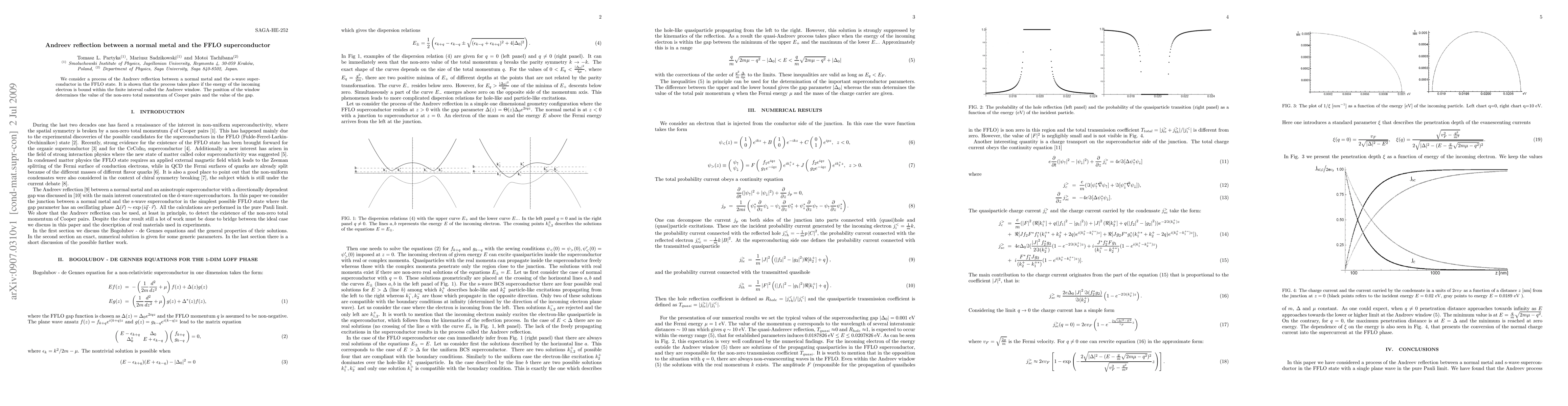 This paper investigates the Andreev reflection occurring between a normal metal and a s-wave superconductor in the FFLO (Fulde-Ferrell-Larkin-Ovchinnikov) state, demonstrating that it occurs within a specific energy range termed the Andreev window, which influences the momentum and gap characteristics of Cooper pairs.