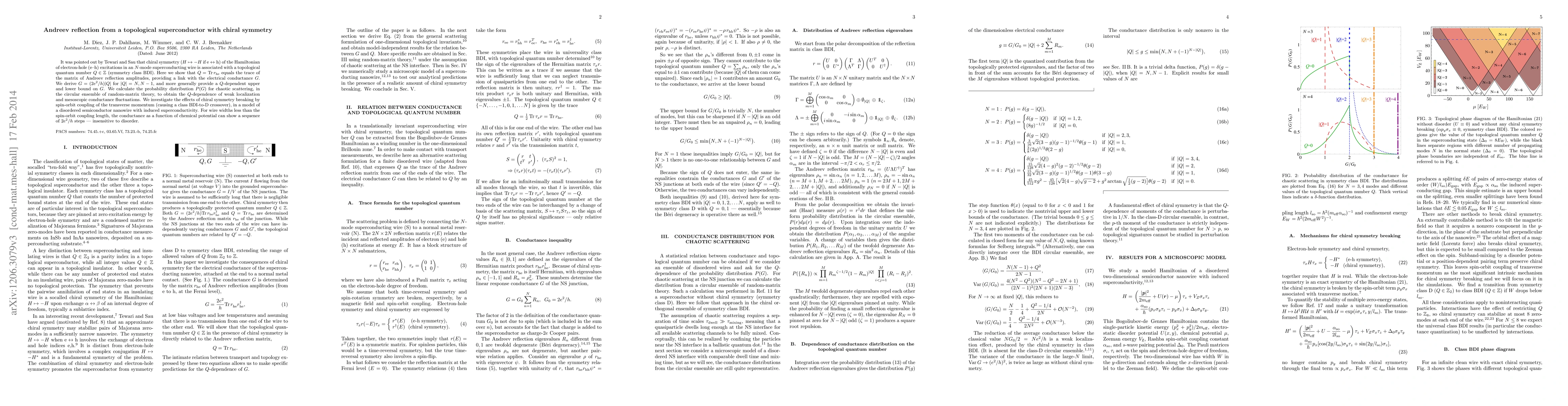 It was pointed out by Tewari and Sau that chiral symmetry (H -> -H if e <-> h) of the Hamiltonian of electron-hole (e-h) excitations in an N-mode superconducting wire is associated with a topological quantum number Q\in\mathbb{Z} (symmetry class BDI). Here we show that Q=Tr(r_{he}) equals the trace of the matrix of Andreev reflection amplitudes, providing a link with the electrical conductance G. We derive G=(2e^2/h)|Q| for |Q|=N,N-1, and more generally provide a Q-dependent upper and lower bound on G. We calculate the probability distribution P(G) for chaotic scattering, in the circular ensemble of random-matrix theory, to obtain the Q-dependence of weak localization and mesoscopic conductance fluctuations. We investigate the effects of chiral symmetry breaking by spin-orbit coupling of the transverse momentum (causing a class BDI-to-D crossover), in a model of a disordered semiconductor nanowire with induced superconductivity. For wire widths less than the spin-orbit coupling length, the conductance as a function of chemical potential can show a sequence of 2e^2/h steps - insensitive to disorder.