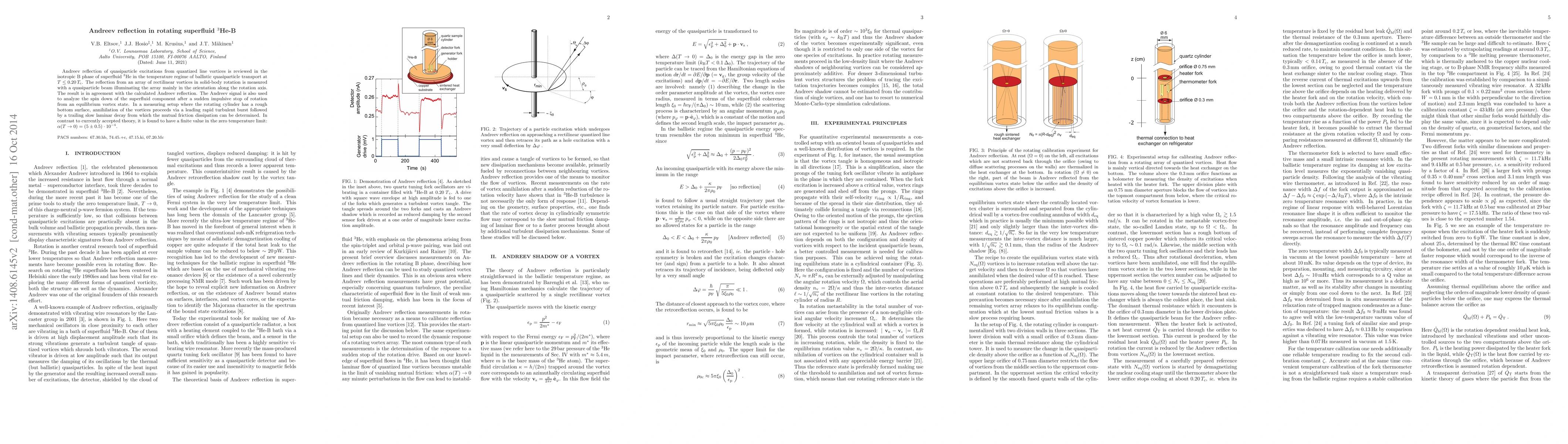 This paper reviews Andreev reflection in superfluid $^3$He-B, demonstrating its occurrence in rotating systems and using it to measure mutual friction dissipation. The study finds mutual friction has a finite value in the zero temperature limit, contradicting current theoretical predictions.