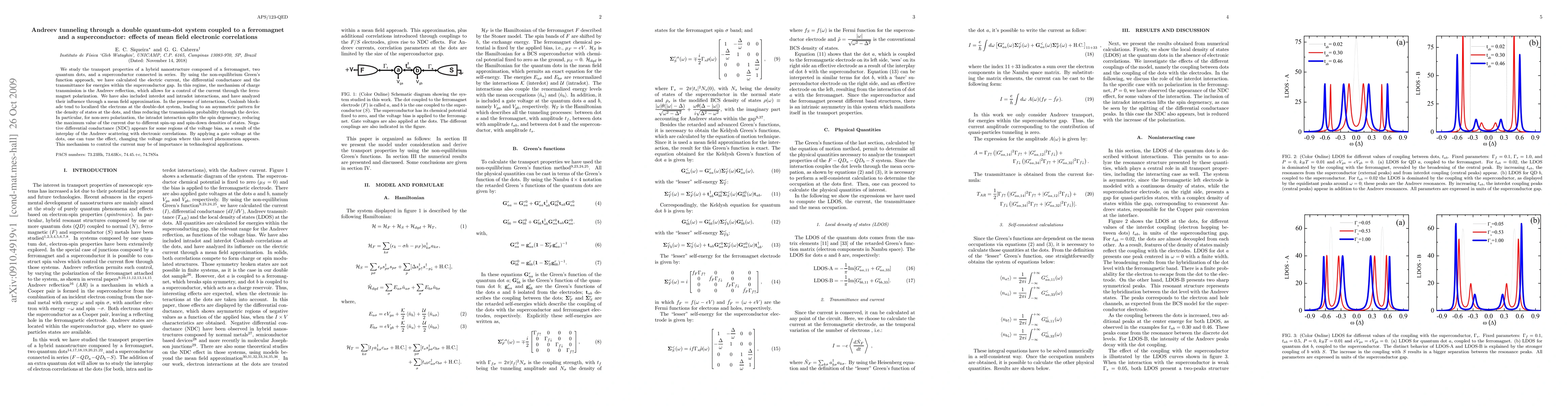 This paper investigates the transport properties of a hybrid nanostructure with a ferromagnet, two quantum dots, and a superconductor, focusing on Andreev tunneling. It reveals that electronic correlations, especially intradot interactions, influence the current through polarization control and lead to phenomena like negative differential conductance, which can be tuned via gate voltage.