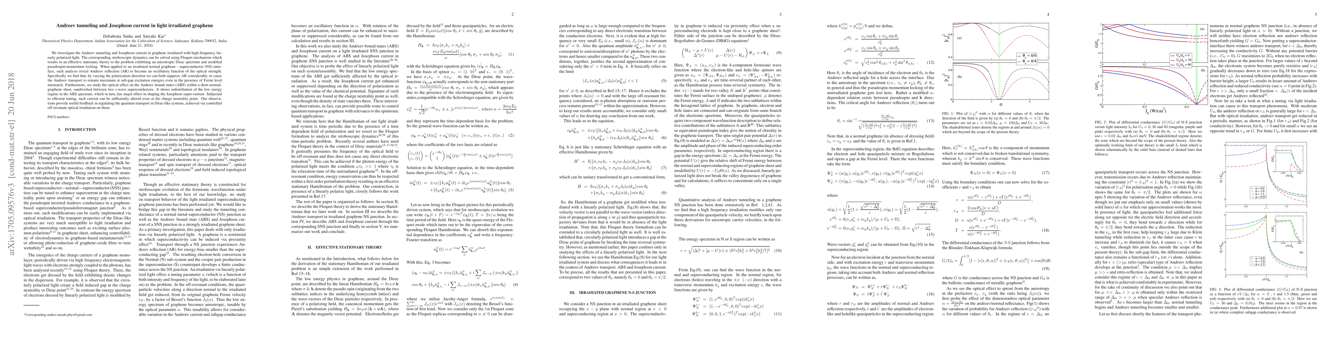 We investigate the Andreev tunneling and Josephson current in graphene irradiated with high-frequency linearly polarized light. The corresponding stroboscopic dynamics can be solved using Floquet mechanism which results in an effective stationary theory to the problem. It exhibits anisotropy in the Dirac spectrum and modifies the so-called pseudospin-momentum locking in graphene. The Andreev reflection at a normal graphene - superconductor (NS) interface becomes an oscillatory function of the optical strength. Specifically we find that, by varying the polarization direction we can both suppress AR considerably or cause the Andreev transport to remain maximum at sub-gap excitation energies even in the presence of Fermi level mismatch. Furthermore, we study the optical effect on the Andreev bound states (ABS) within a short normal-graphene sheet, sandwiched between two s-wave superconductors. It shows redistribution of the low energy regime in the ABS spectrum, which in turn, has major effect in shaping the Josephson super-current. Subjected to efficient tuning, such current can be sufficiently altered even at the charge neutrality point. Our observations provide useful feedback in regulating the quantum transport in Dirac-like systems, achieved via controlled off-resonant optical irradiation on them.
