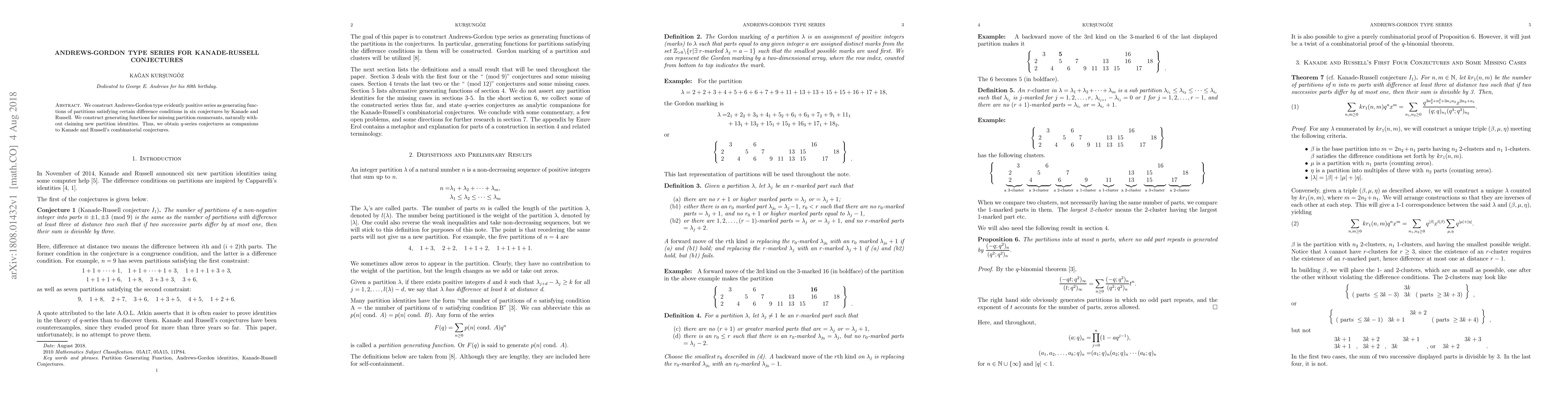 We construct Andrews-Gordon type evidently positive series as generating functions of partitions satisfying certain difference conditions in six conjectures by Kanade and Russell. We construct generating functions for missing partition enumerants, naturally without claiming new partition identities. Thus, we obtain $q$-series conjectures as companions to Kanade and Russell's combinatorial conjectures.