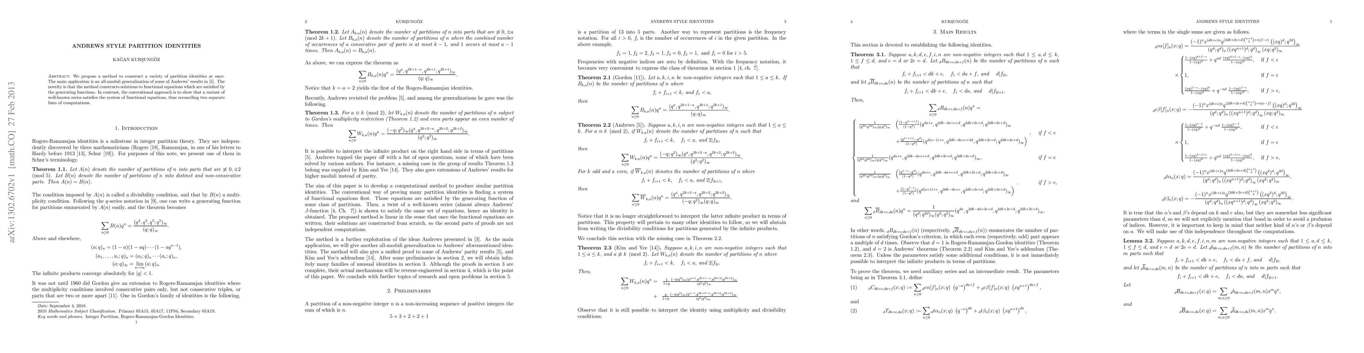 We propose a method to construct a variety of partition identities at once. The main application is an all-moduli generalization of some of Andrews' results in [5]. The novelty is that the method constructs solutions to functional equations which are satisfied by the generating functions. In contrast, the conventional approach is to show that a variant of well-known series satisfies the system of functional equations, thus reconciling two separate lines of computations.