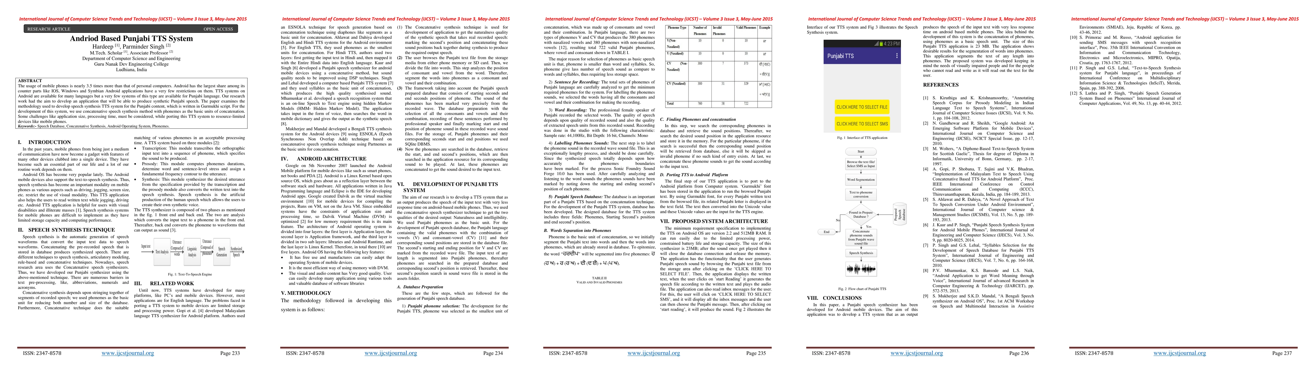 This paper develops an Android-based Punjabi Text-to-Speech (TTS) system using concatenative speech synthesis with phonemes. It addresses challenges such as application size and processing time for efficient deployment on mobile phones.