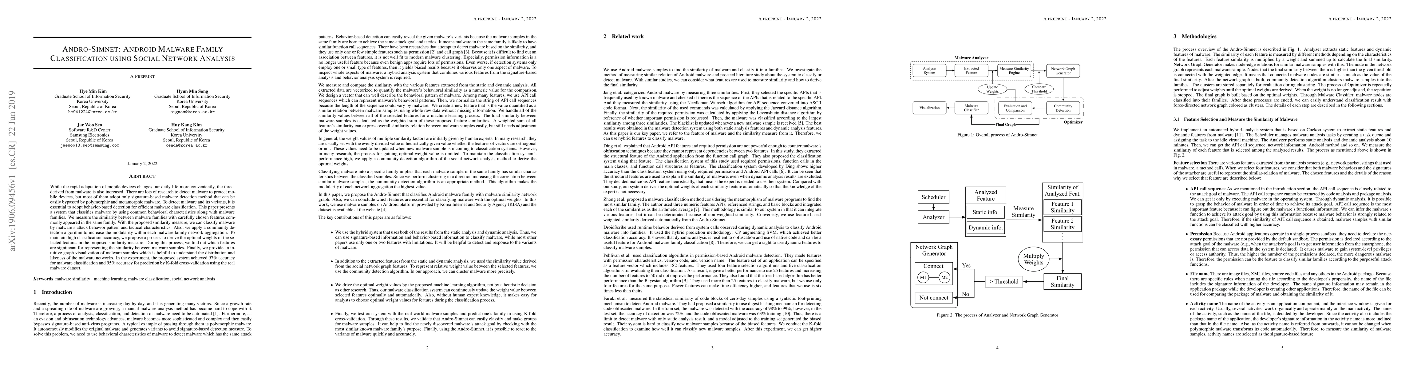 This paper introduces Andro-Simnet, a system for classifying Android malware families using behavioral characteristics and social network analysis. It employs a similarity measure based on selected features to achieve 97% classification accuracy and 95% prediction accuracy, enhanced by community detection and optimal feature weighting.