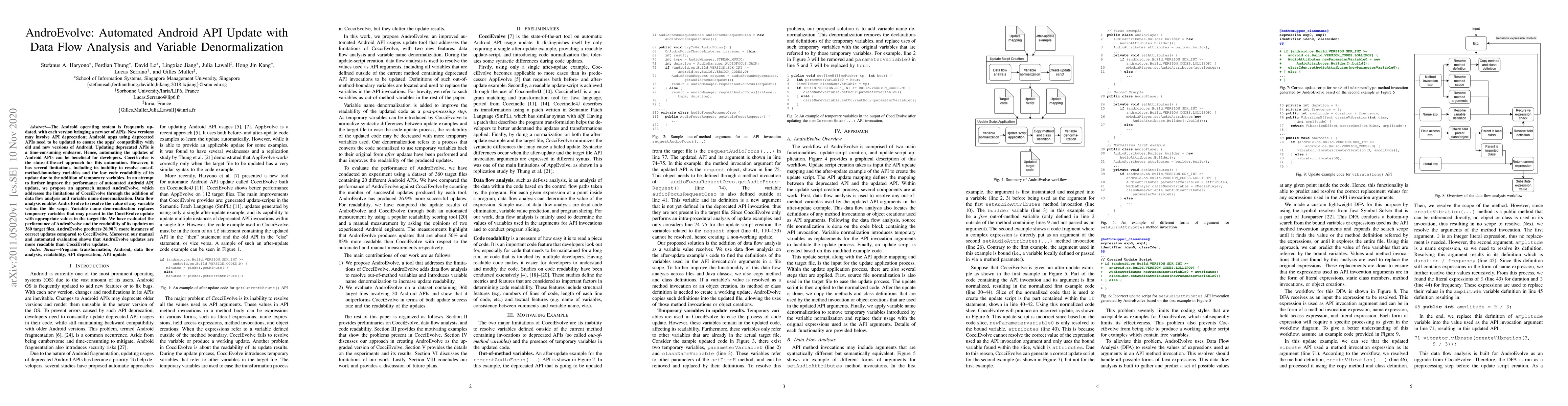 AndroEvolve automates Android API updates by incorporating data flow analysis and variable denormalization, improving upon CocciEvolve's limitations in resolving out-of-method-boundary variables and enhancing code readability through the elimination of temporary variables. Evaluations show AndroEvolve produces 26.90% more correct updates and more readable code compared to CocciEvolve.