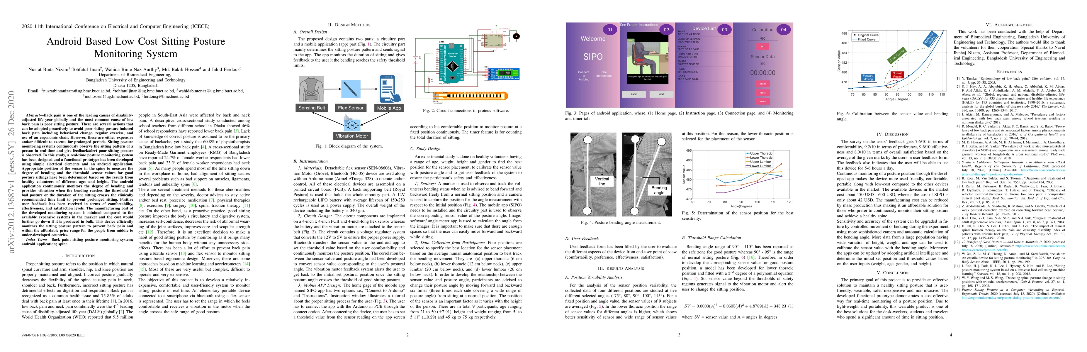 This study developed a low-cost Android-based sitting posture monitoring system to prevent back pain caused by poor posture. The system uses simple sensors and an Android app to provide real-time feedback and alerts, receiving positive feedback for comfortability and effectiveness, while being significantly cheaper than existing solutions.