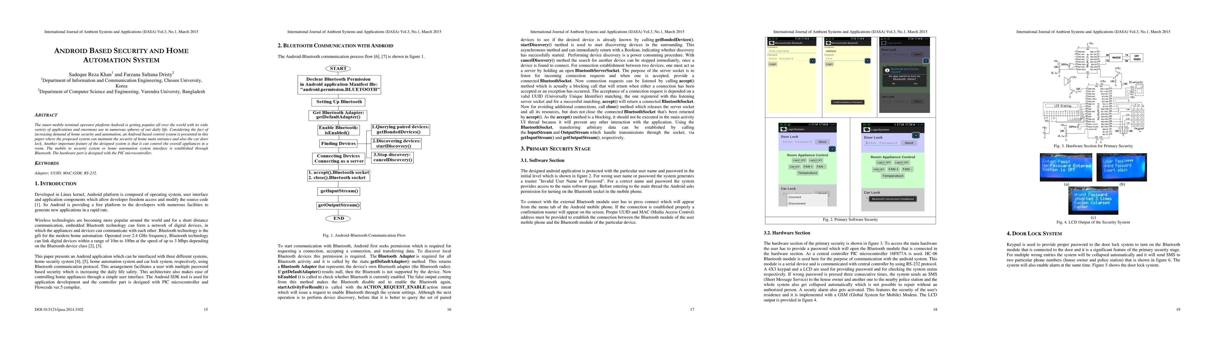 This paper proposes an Android-based system for home security and automation, utilizing Bluetooth for mobile interface control. The system secures the main entrance and car door locks and can manage room appliances via a PIC microcontroller.