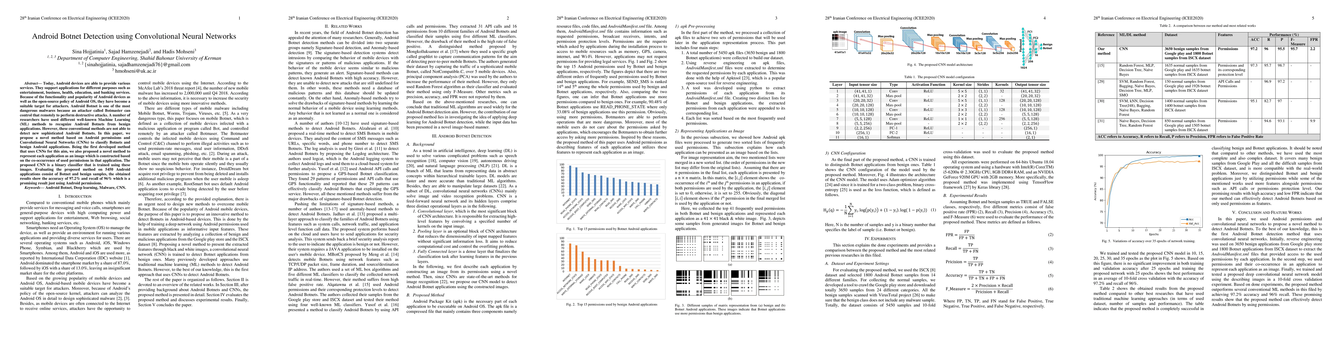 This paper proposes a novel method for detecting Android Botnets using Convolutional Neural Networks (CNNs) and Android permissions. The method represents applications as images based on permission co-occurrence, which the CNN classifies, achieving 97.2% accuracy and 96% recall on a dataset of 5450 applications.