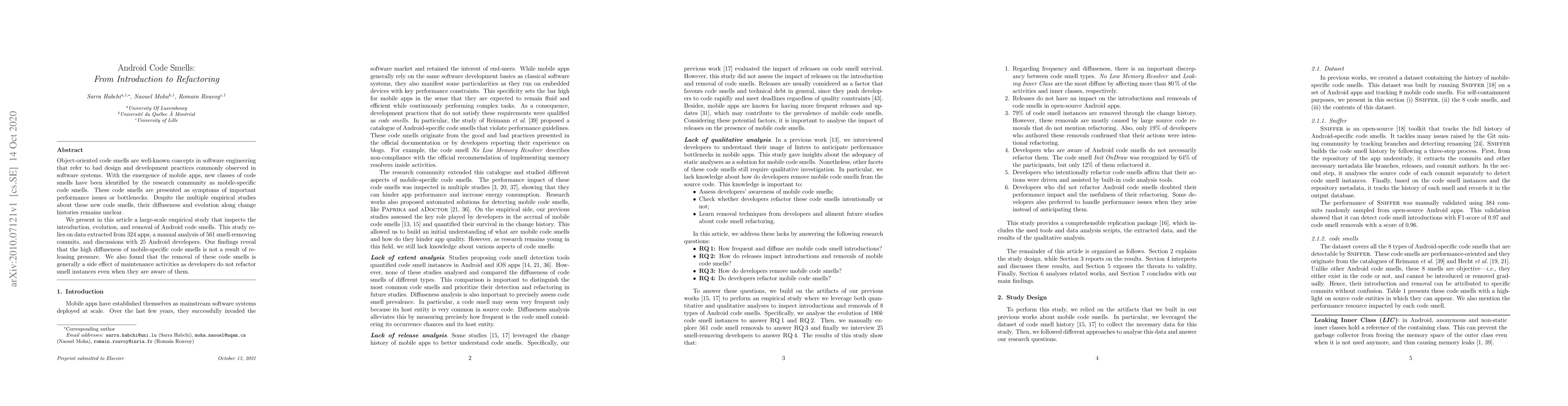 This paper investigates the introduction, evolution, and removal of Android-specific code smells through a large-scale empirical study involving 324 apps and interviews with 25 developers. Findings indicate that these code smells persist due to maintenance activities rather than intentional refactoring, despite developers' awareness of them.