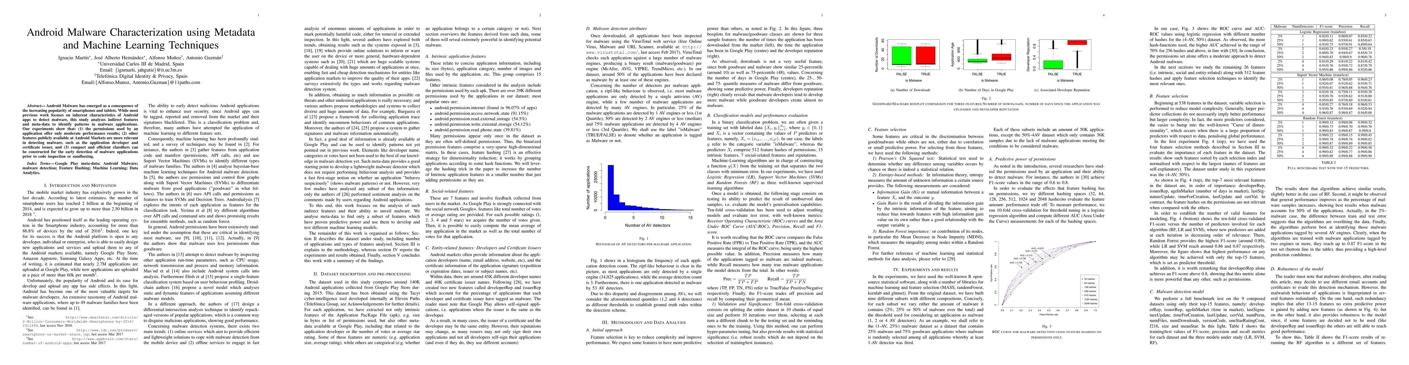 This study investigates Android malware detection using metadata and machine learning, finding that while app permissions provide moderate results, features like developer and certificate issuer details are more effective. Efficient classifiers can be built for early malware detection without code inspection.