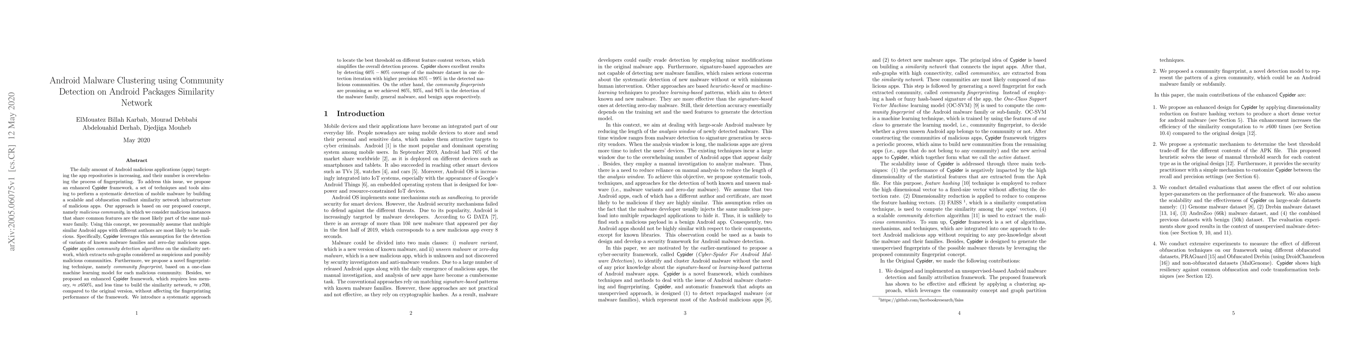 This paper proposes an enhanced Cypider framework for detecting Android malware using community detection on a similarity network of Android packages. It introduces a novel fingerprinting technique and a systematic approach to identify malicious communities, improving detection efficiency and reducing resource requirements.