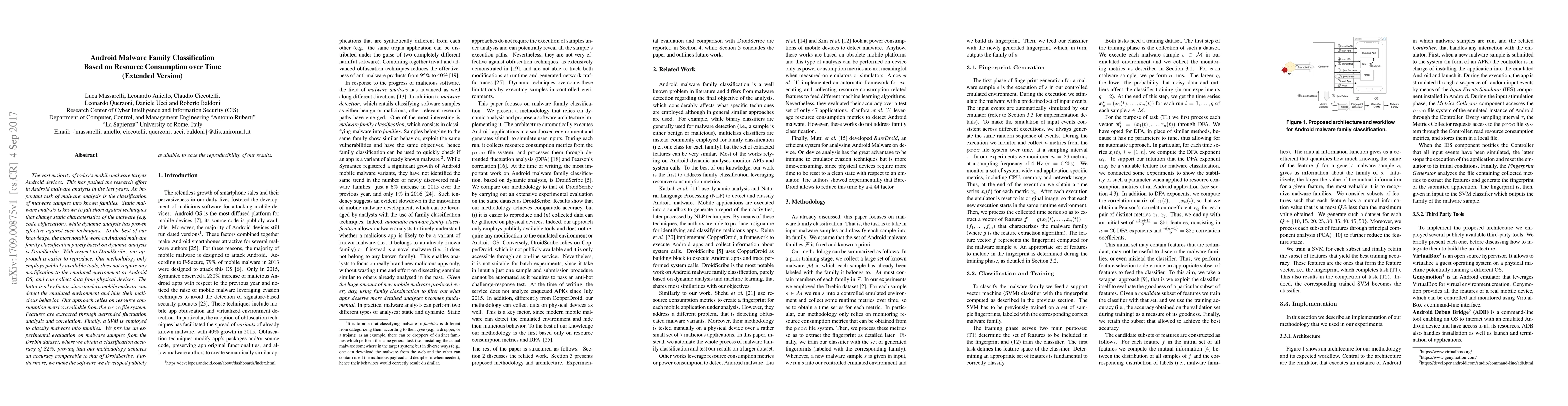 This paper proposes a dynamic analysis method for classifying Android malware families based on resource consumption over time, using publicly available tools and without modifying the emulated environment. The approach achieves 82% classification accuracy on the Drebin dataset, comparable to DroidScribe, and is designed to avoid detection by modern malware that can identify virtual environments.