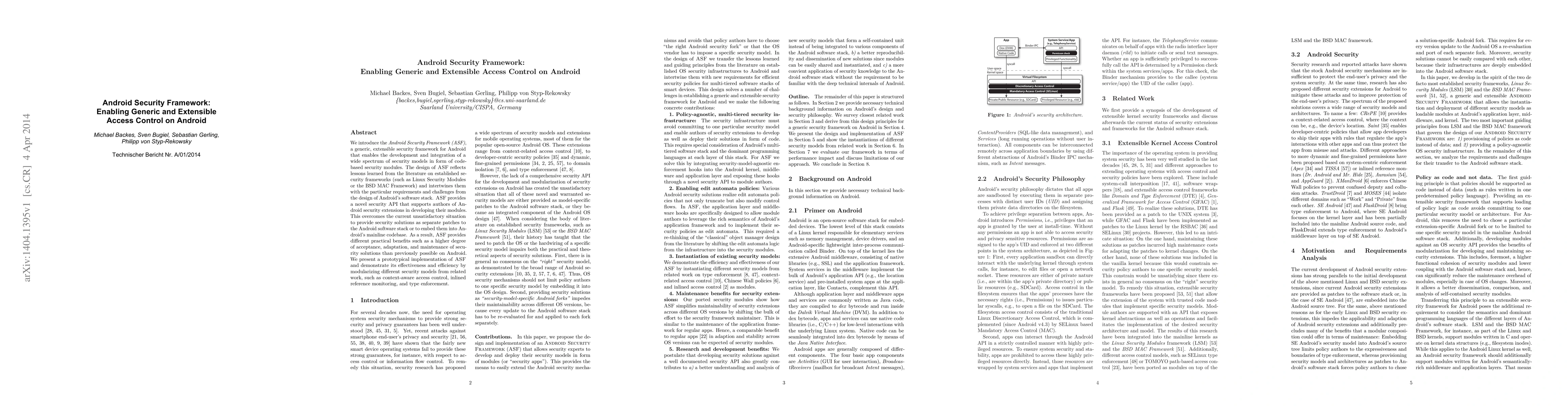 The Android Security Framework (ASF) offers a generic, extensible security architecture for Android, enabling diverse security models through modular code-based modules. It provides a novel API that enhances the adaptability and maintainability of security solutions, addressing the limitations of previous patch-based security implementations.