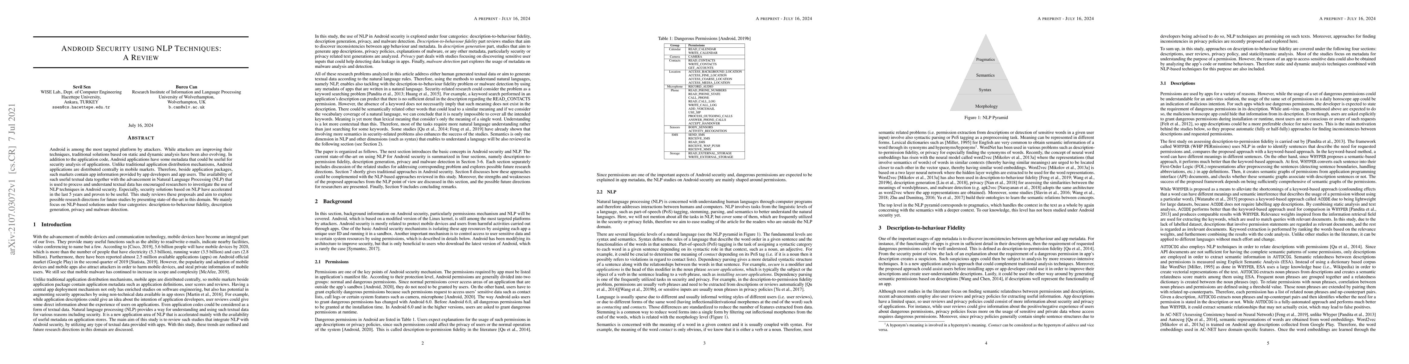 This study reviews NLP techniques for Android security, focusing on four categories: behavior fidelity, description generation, privacy, and malware detection. It aims to explore future research directions in this field, highlighting the potential of NLP-based solutions.