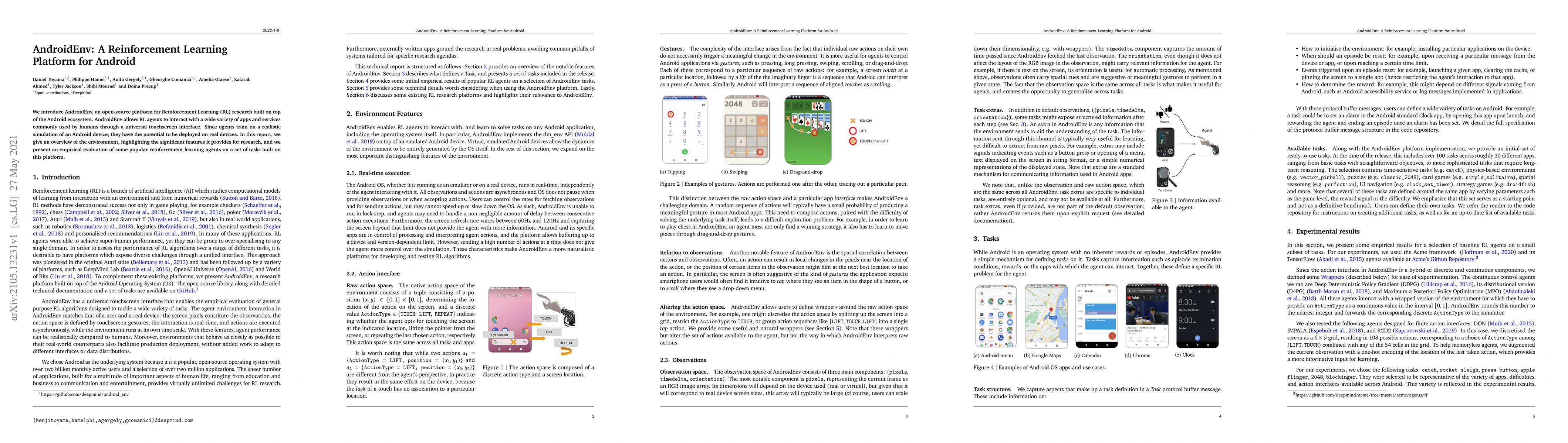 AndroidEnv is an open-source reinforcement learning platform built on the Android ecosystem, enabling RL agents to interact with real-world apps via a touchscreen interface. This platform facilitates realistic training and potential deployment on actual Android devices, as demonstrated by an empirical evaluation of popular RL agents on various tasks.