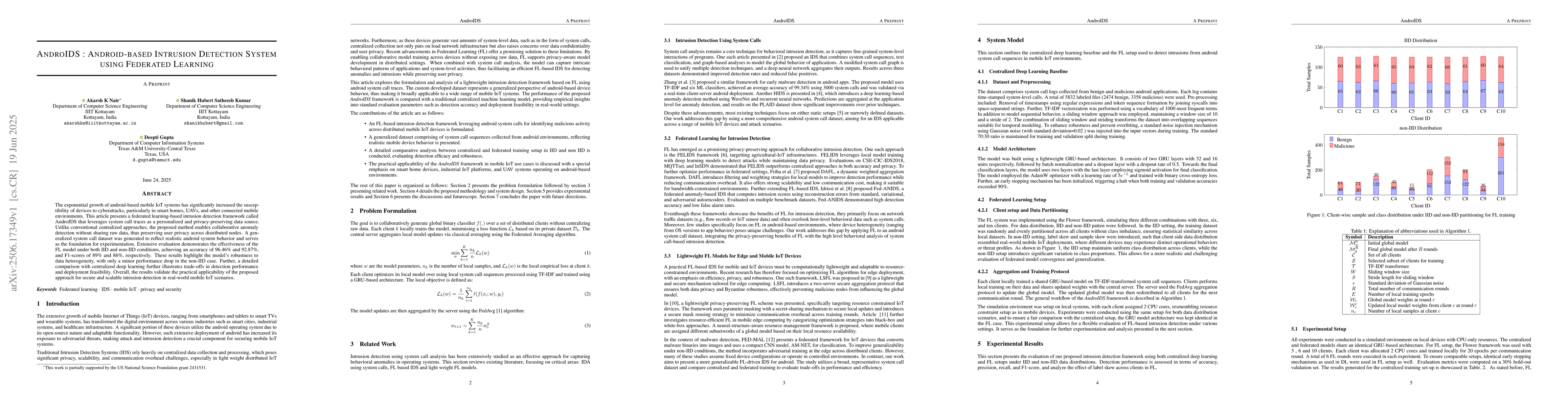 The research introduces AndroIDS, a federated learning-based intrusion detection system for Android devices using system call traces. It employs a lightweight GRU-based architecture, TF-IDF vectorization, and a sliding window approach for temporal modeling. The system was evaluated under both IID and non-IID data distributions using the Flower framework with 3, 6, and 10 clients.