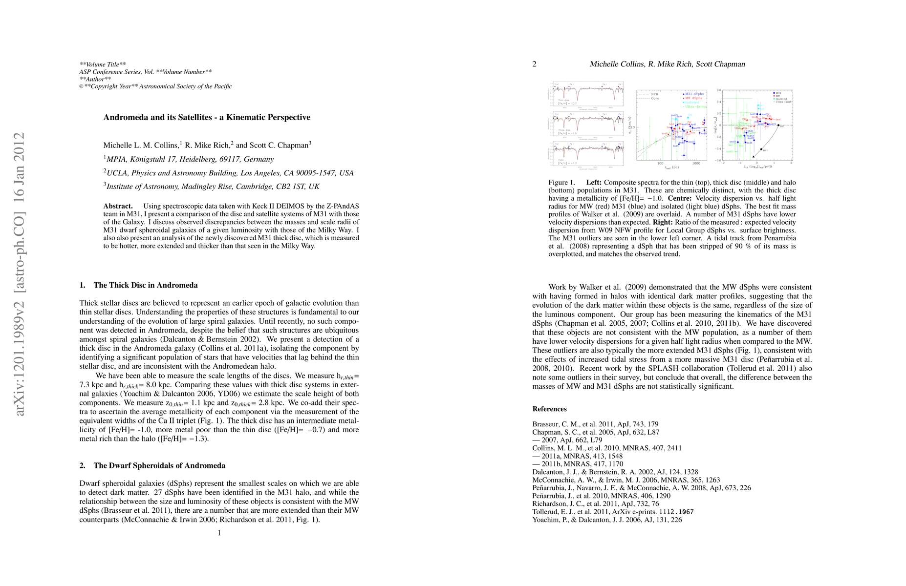 This paper compares the kinematic properties of Andromeda's disc and satellite systems with those of the Milky Way, highlighting discrepancies in the masses and scale radii of Andromeda's dwarf galaxies. It also reveals the newly discovered M31 thick disc, which is hotter, more extended, and thicker than the Milky Way's.