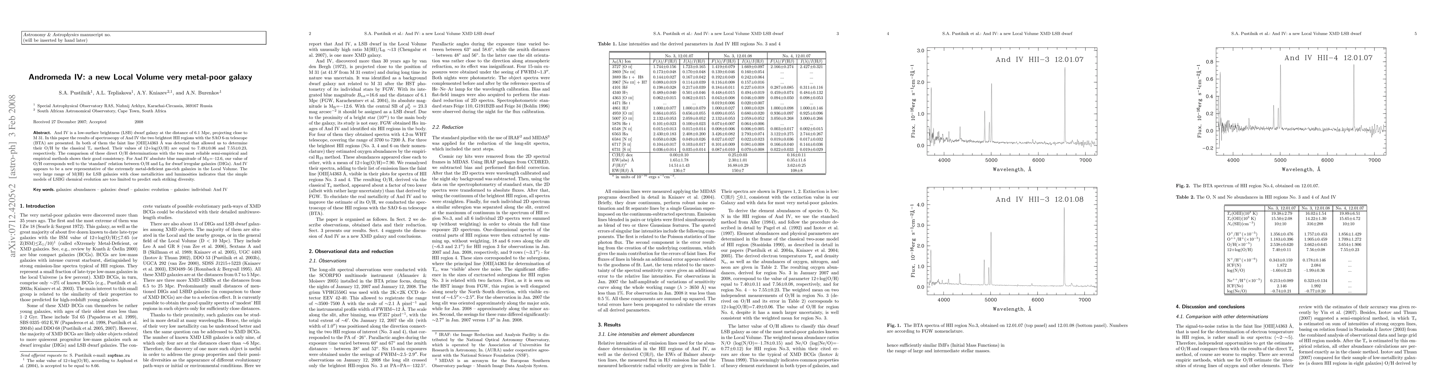 And IV is a low-surface brightness (LSB) dwarf galaxy at the distance of 6.1 Mpc, projecting close to M 31. In this paper the results of spectroscopy of And IV the two brightest HII regions with the SAO 6-m telescope (BTA) are presented. In both of them the faint line [OIII]4363 was detected that allowed us to determine their O/H by the classical T_e method. Their values of 12+log(O/H) are equal to 7.49+-0.06 and 7.55+-0.23, respectively. The comparison of these direct O/H determinations with the two most reliable semi-empirical and empirical methods shows their good consistency. For And IV absolute blue magnitude of M_B=-12.6, our value of O/H corresponds well to the `standard' relation between O/H and L_B for dwarf irregular galaxies (DIGs). And IV appears to be a new representative of the extremely metal-deficient gas-rich galaxies in the Local Volume. The very large range of M(HI) for LSB galaxies with close metallicities and luminosities indicates that the simple models of LSBG chemical evolution are too limited to predict such striking diversity.